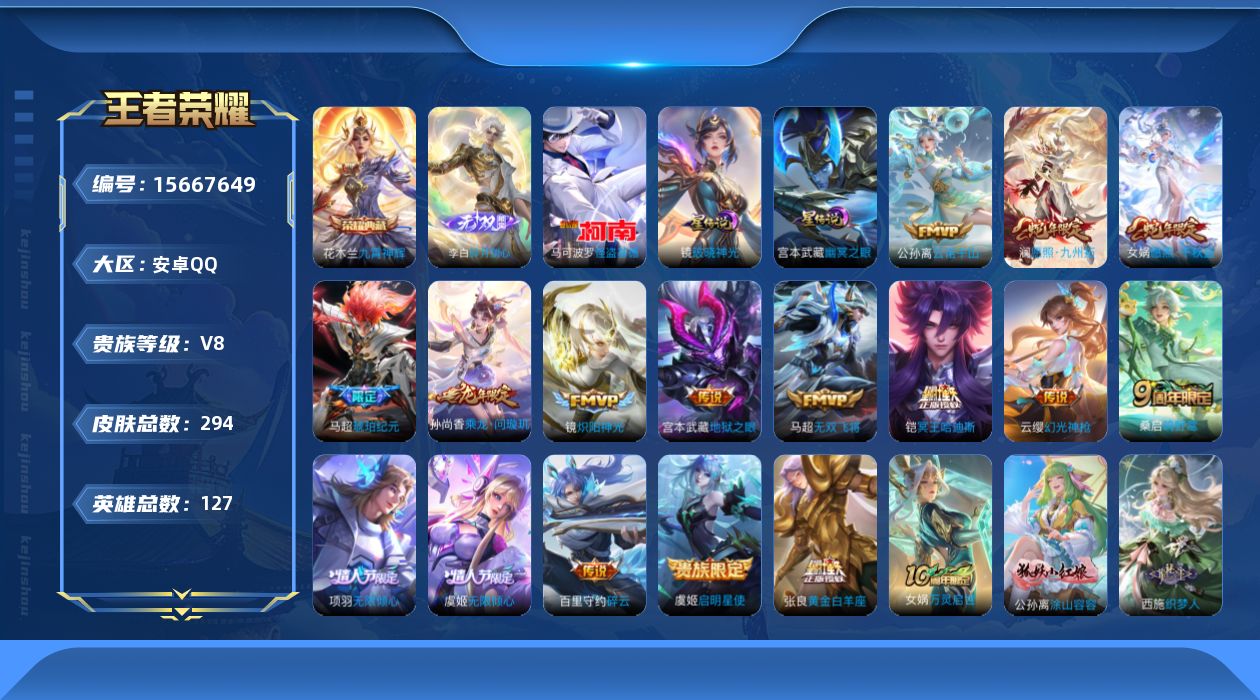 127英雄-294皮肤-V8-1典藏1无双1珍品传说16传说 发育路32段 打野30段 万战金标百里