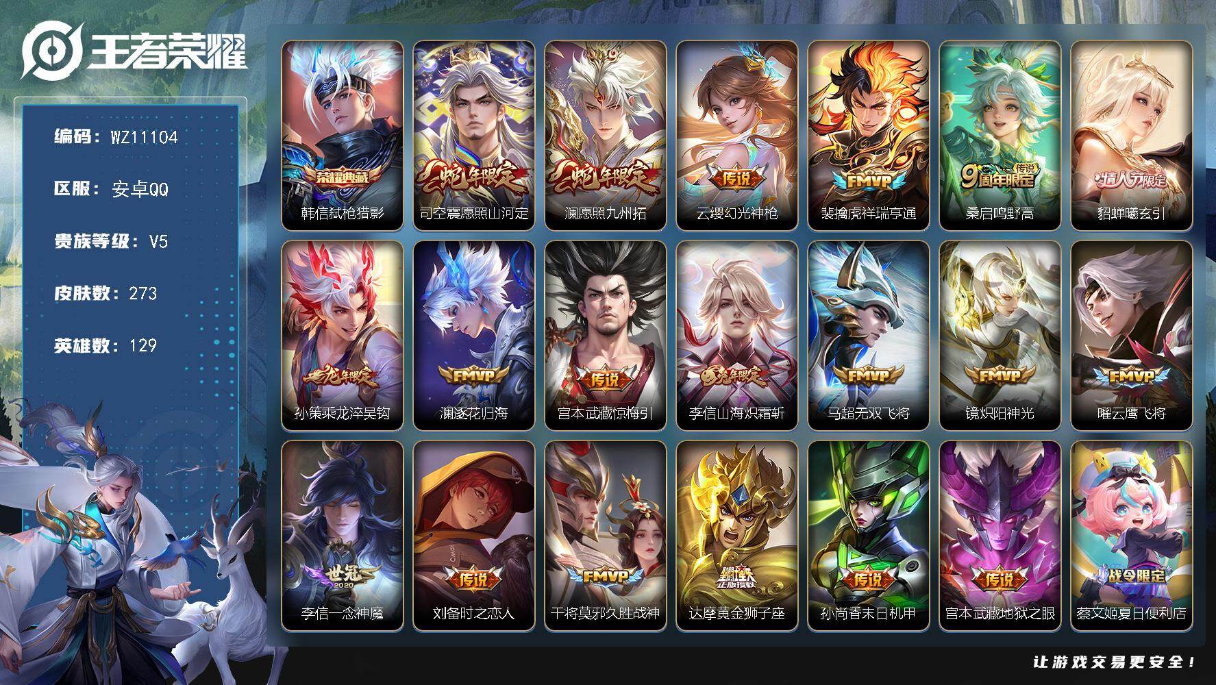 安卓Q-V5-最强王者段位-129英雄-273皮肤-1典藏皮肤-19传说-84