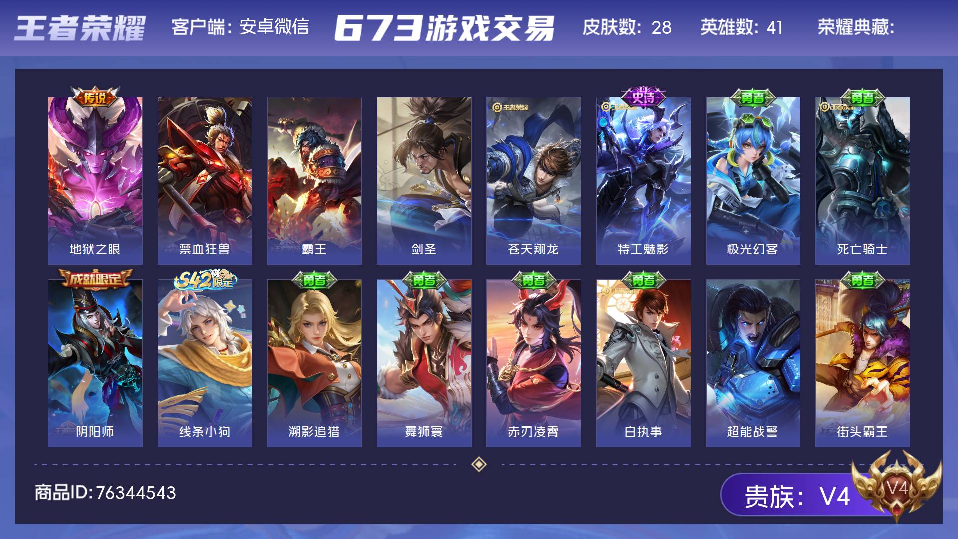 V4 皮肤28 英雄41 至尊星耀 传说1