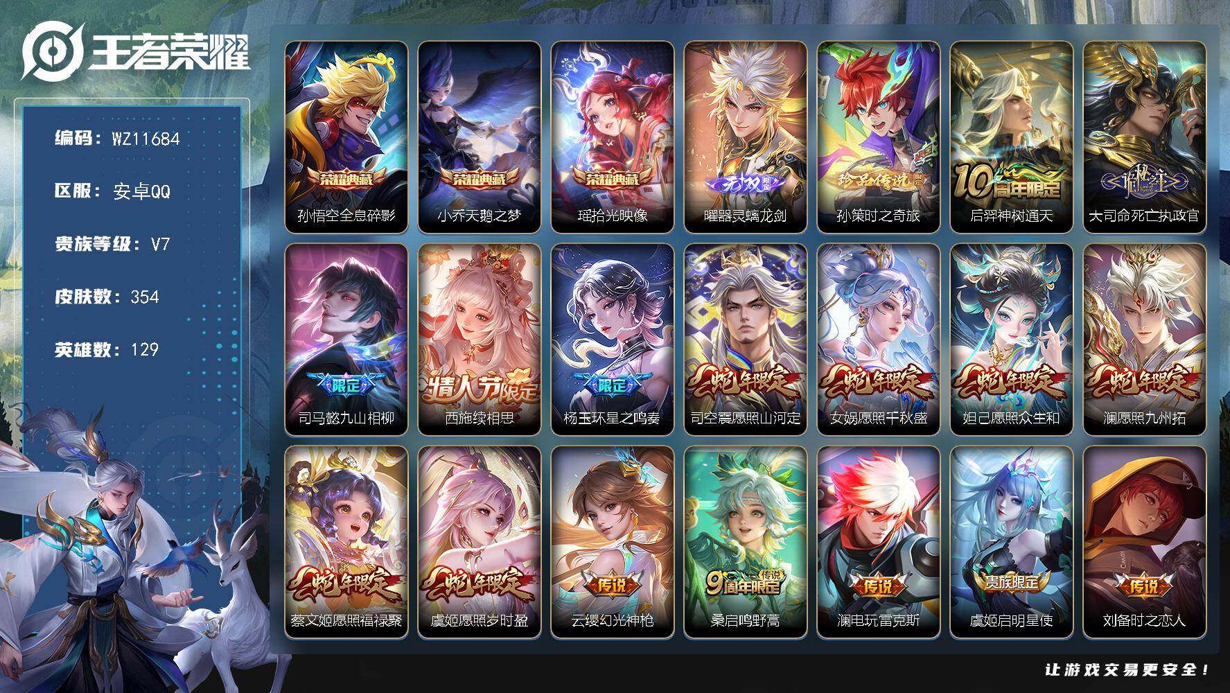 安卓Q-V7-至尊星耀III段位-129英雄-354皮肤-3典藏皮肤-1无双-