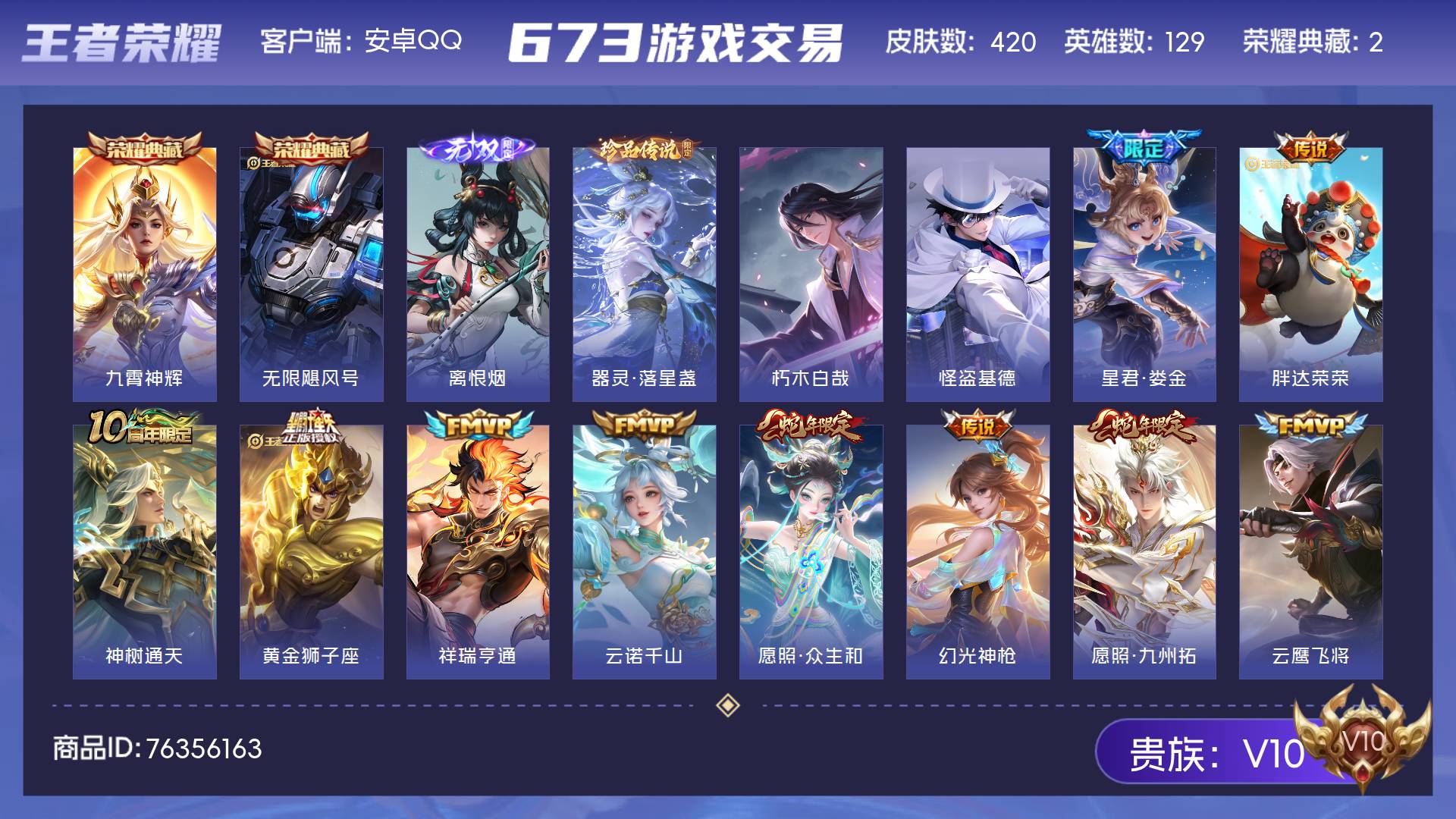 V10 皮肤420 英雄129 荣耀王者 荣耀典藏2 无双皮肤1 珍品传说3 星传说4 传说35