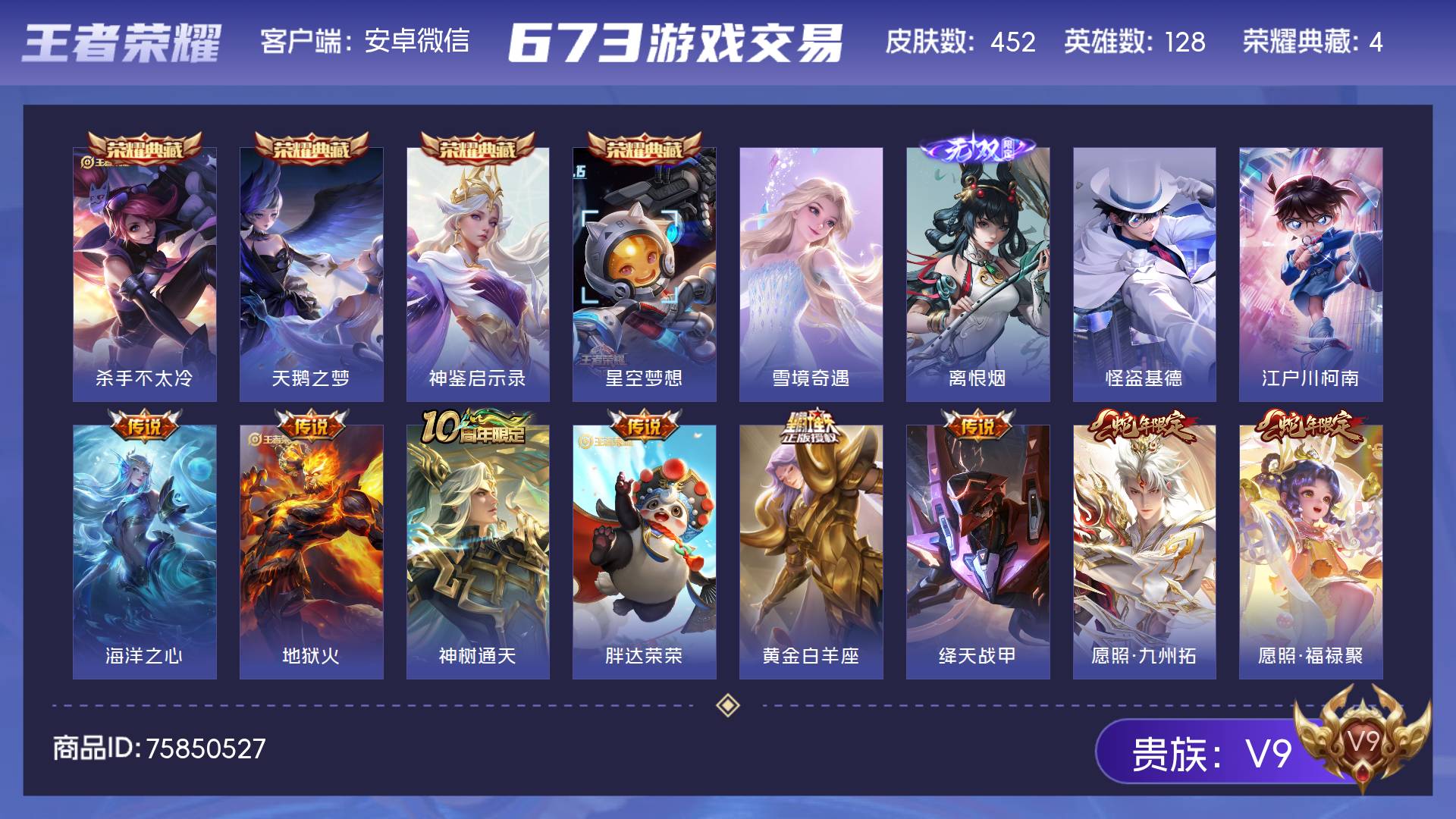 V9 皮肤452 英雄128 至尊星耀 荣耀典藏4 无双皮肤2 珍品传说2 星传说5 传说36 其他皮肤414