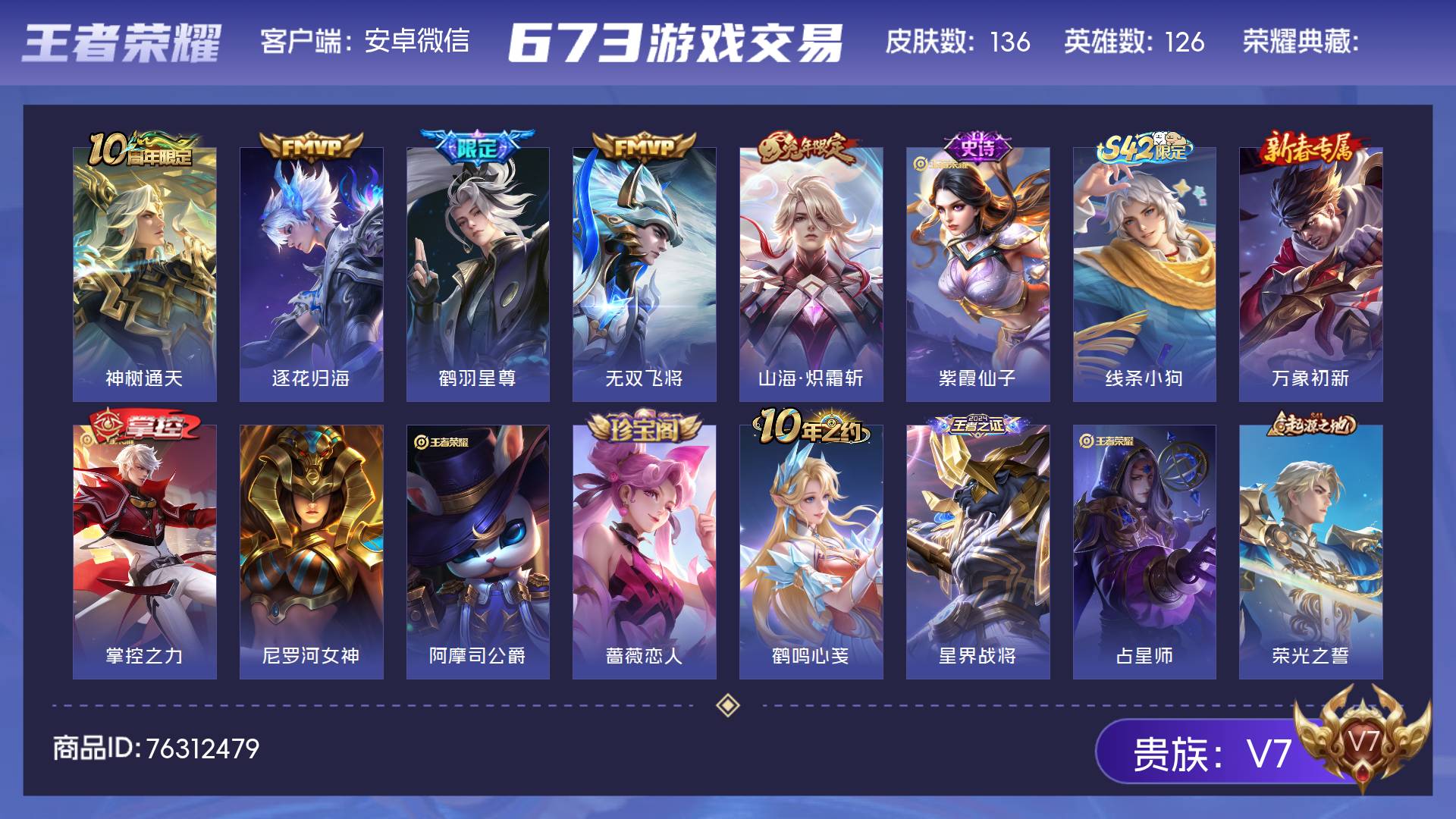 V7 皮肤136 英雄126 至尊星耀 传说5