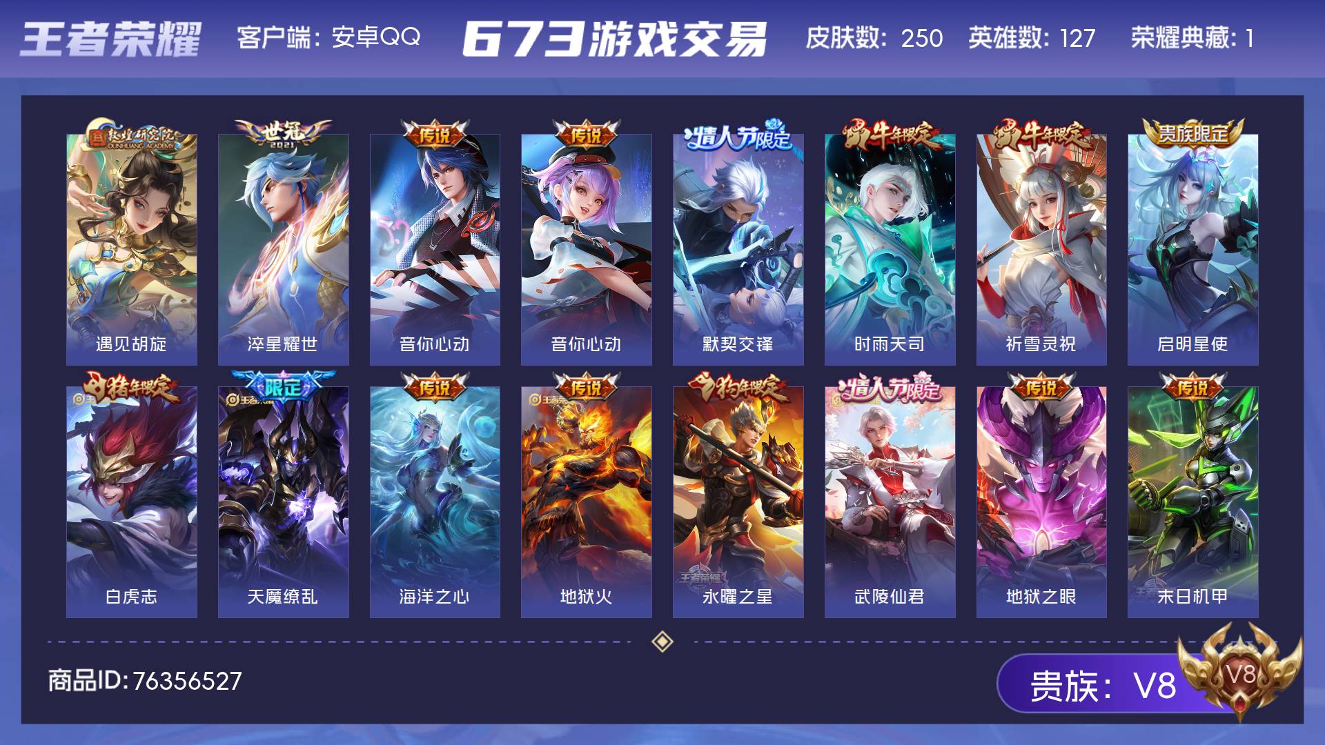V8 皮肤250 英雄127 荣耀黄金 荣耀典藏1 传说19