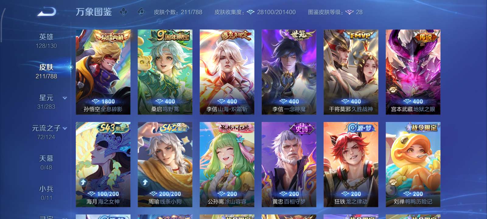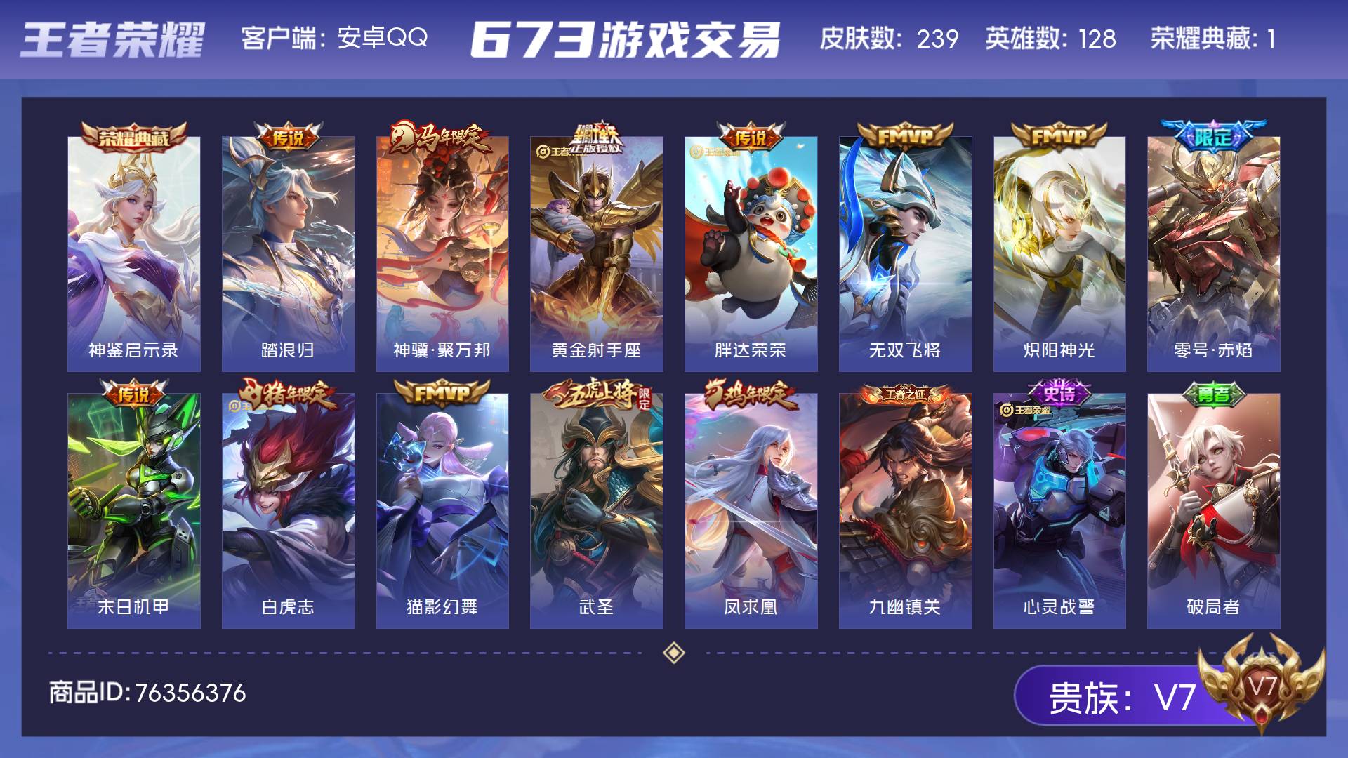 V7 皮肤239 英雄128 永恒钻石 荣耀典藏1 星传说1 传说12