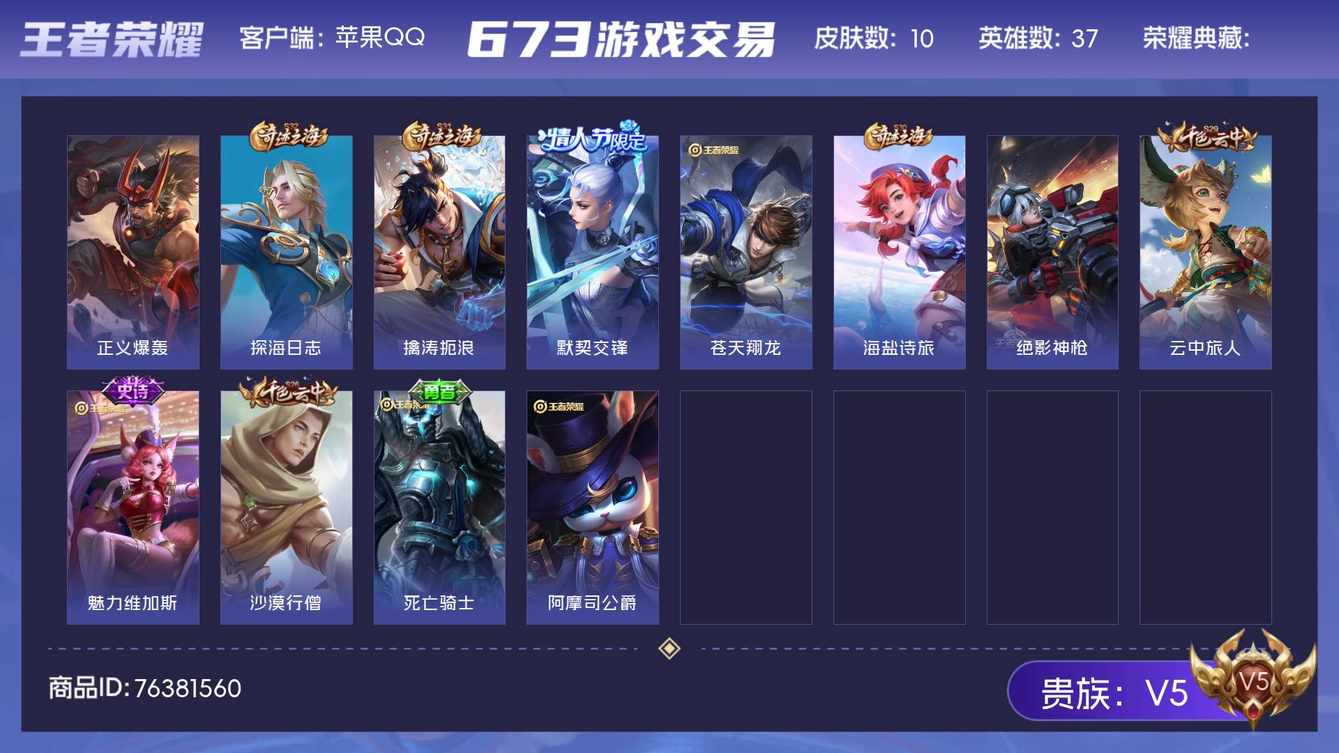 V7 皮肤276 英雄127 至尊星耀 荣耀典藏2 无双皮肤1 珍品传说1 星传说3 传说16 其他