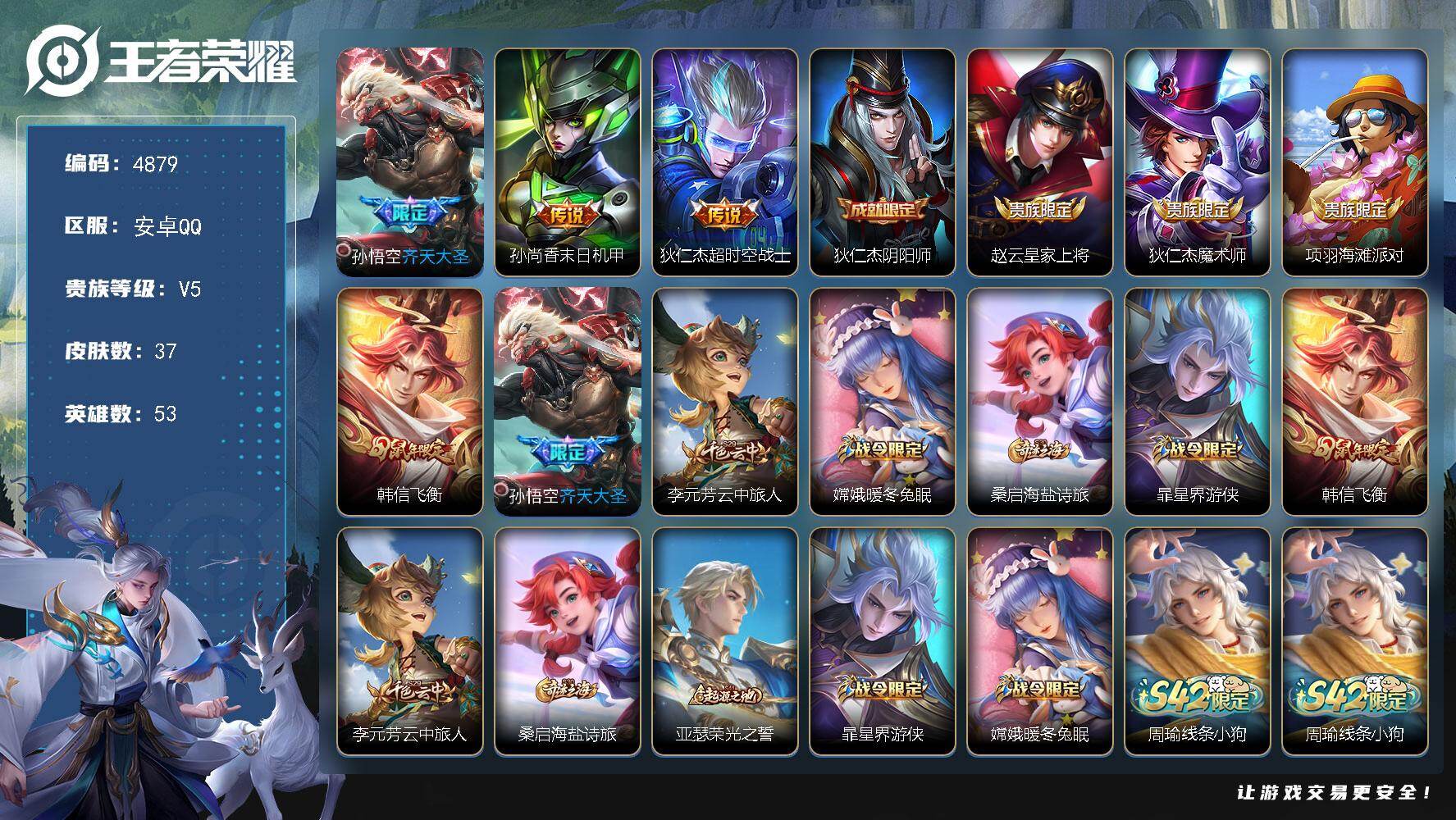 安卓Q-V5-永恒钻石V段位-53英雄-37皮肤-3传说-12史诗【传说皮肤