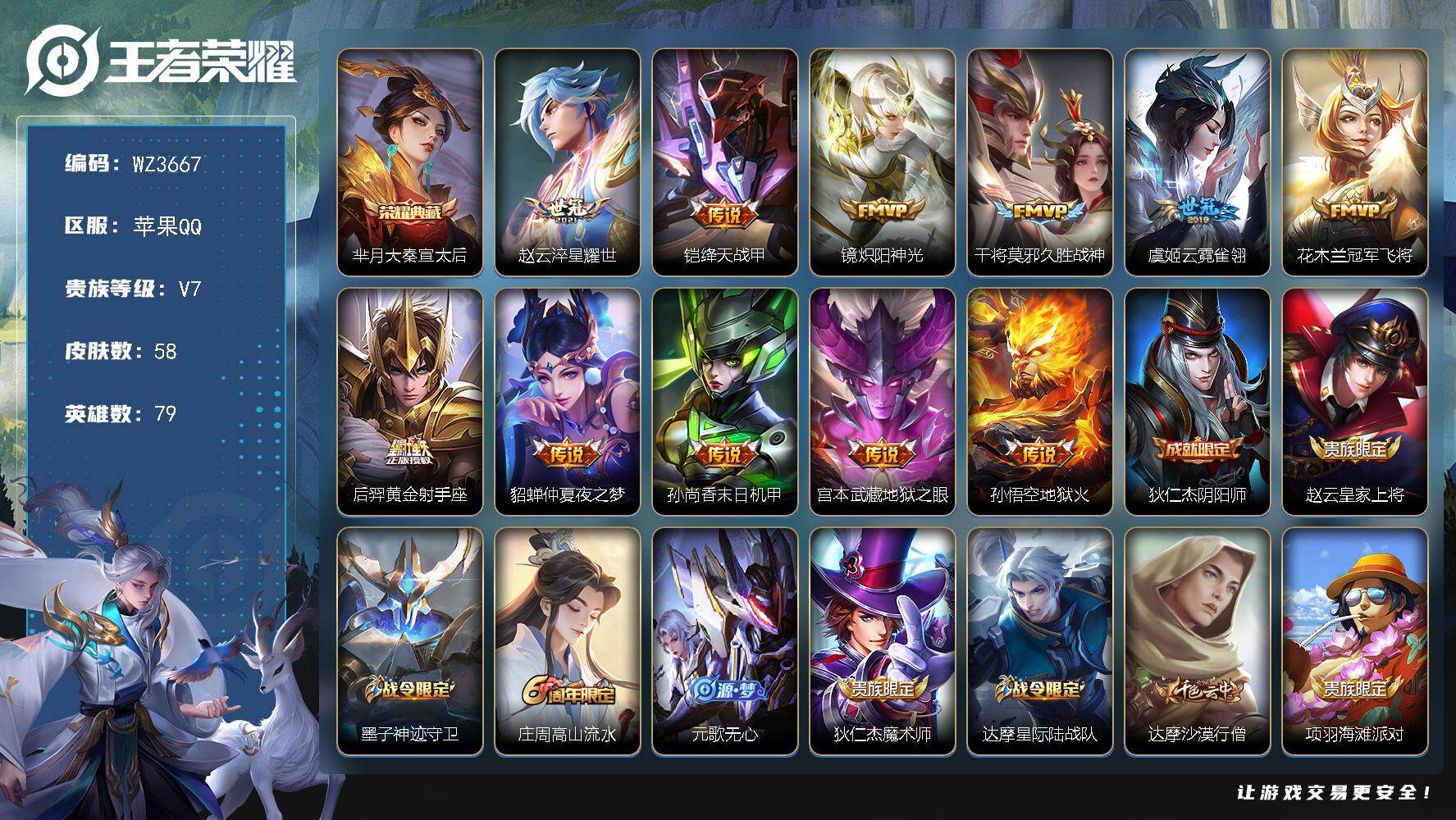 【秒换绑】苹果Q-V7-永恒钻石III段位-79英雄-58皮肤-1典藏皮肤-1