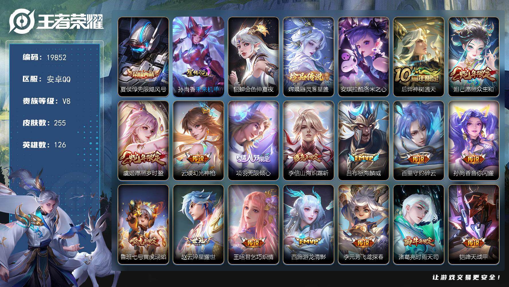 安卓v/无双王者/221皮肤/125英雄/1典藏/0珍品无双/2无双/2珍品传说/19传说/87史