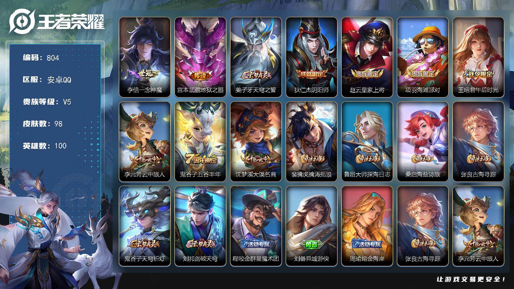 1941071 王者荣耀账号 安卓Q-V5-最强王者段位-100英雄-98皮肤