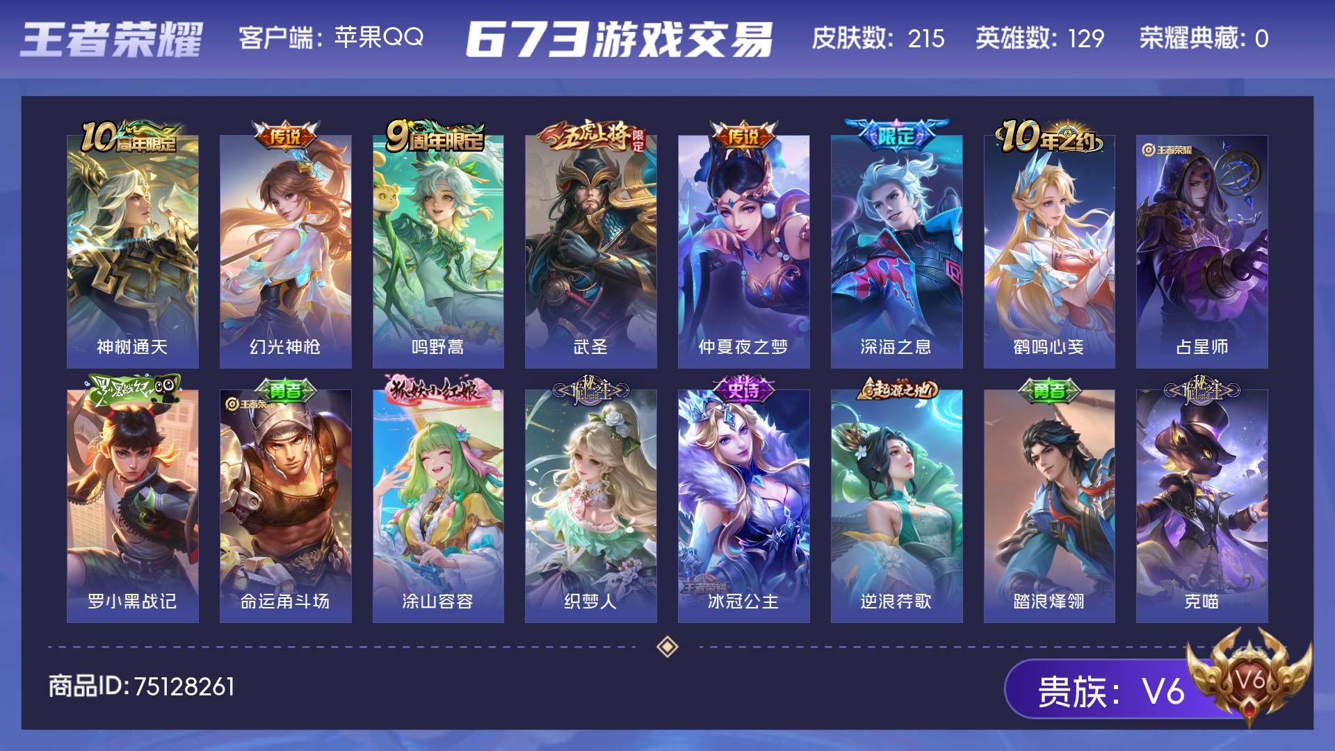 V6 皮肤215 英雄129 至尊星耀 传说6 其他皮肤215