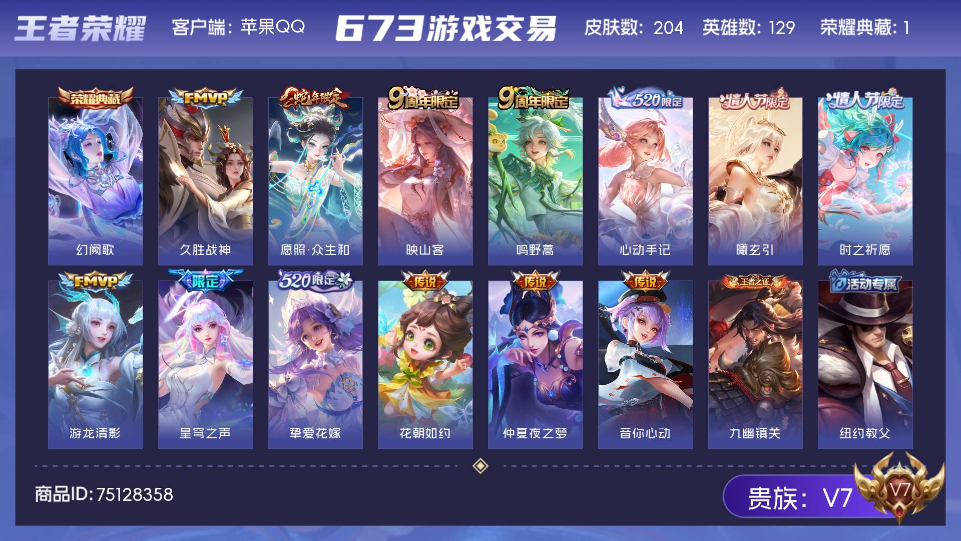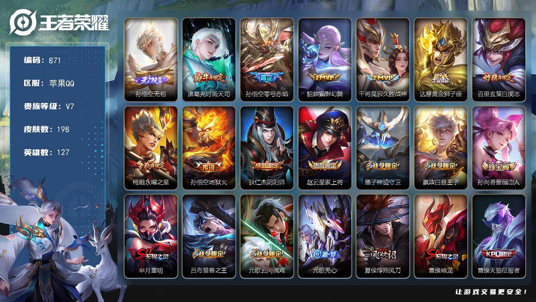 苹果Q-V7-永恒钻石II段位-127英雄-198皮肤-1无双-8传说-46史