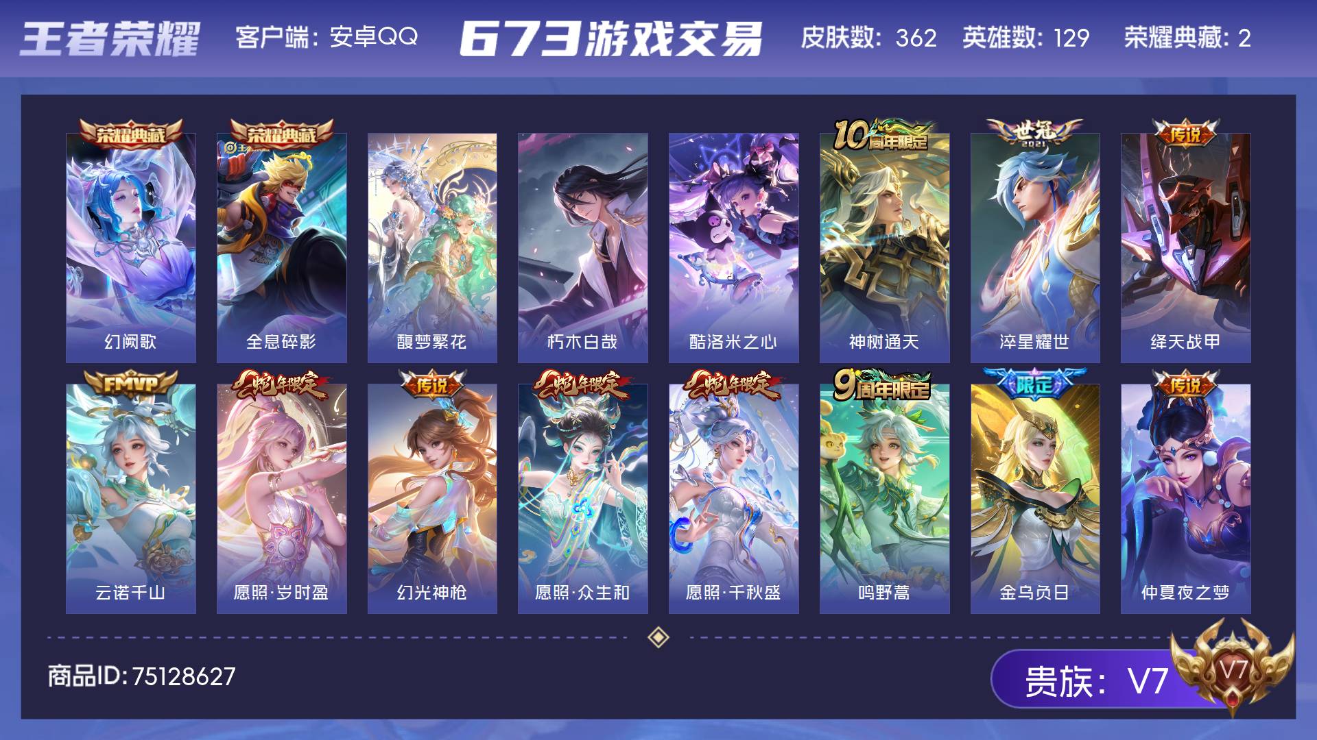 V7 皮肤362 英雄129 至尊星耀 荣耀典藏2 珍品无双1 珍品传说2 星传说7 传说11 其他皮肤352