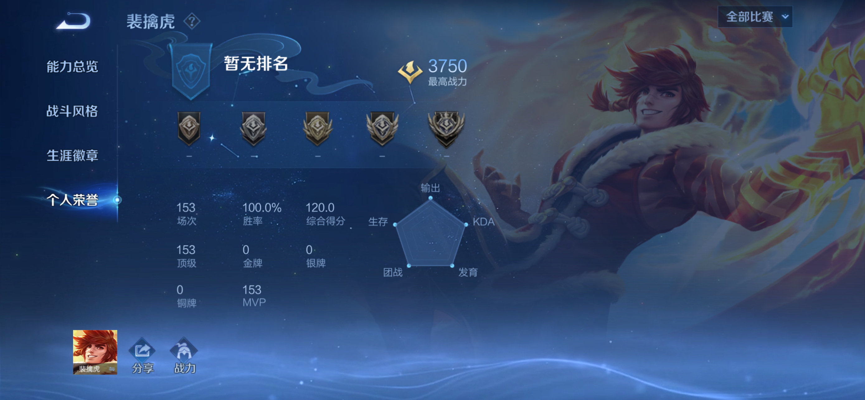 实名: 可修改 贵族等级: V5 英雄数: 125 皮肤数: 155 星传说: