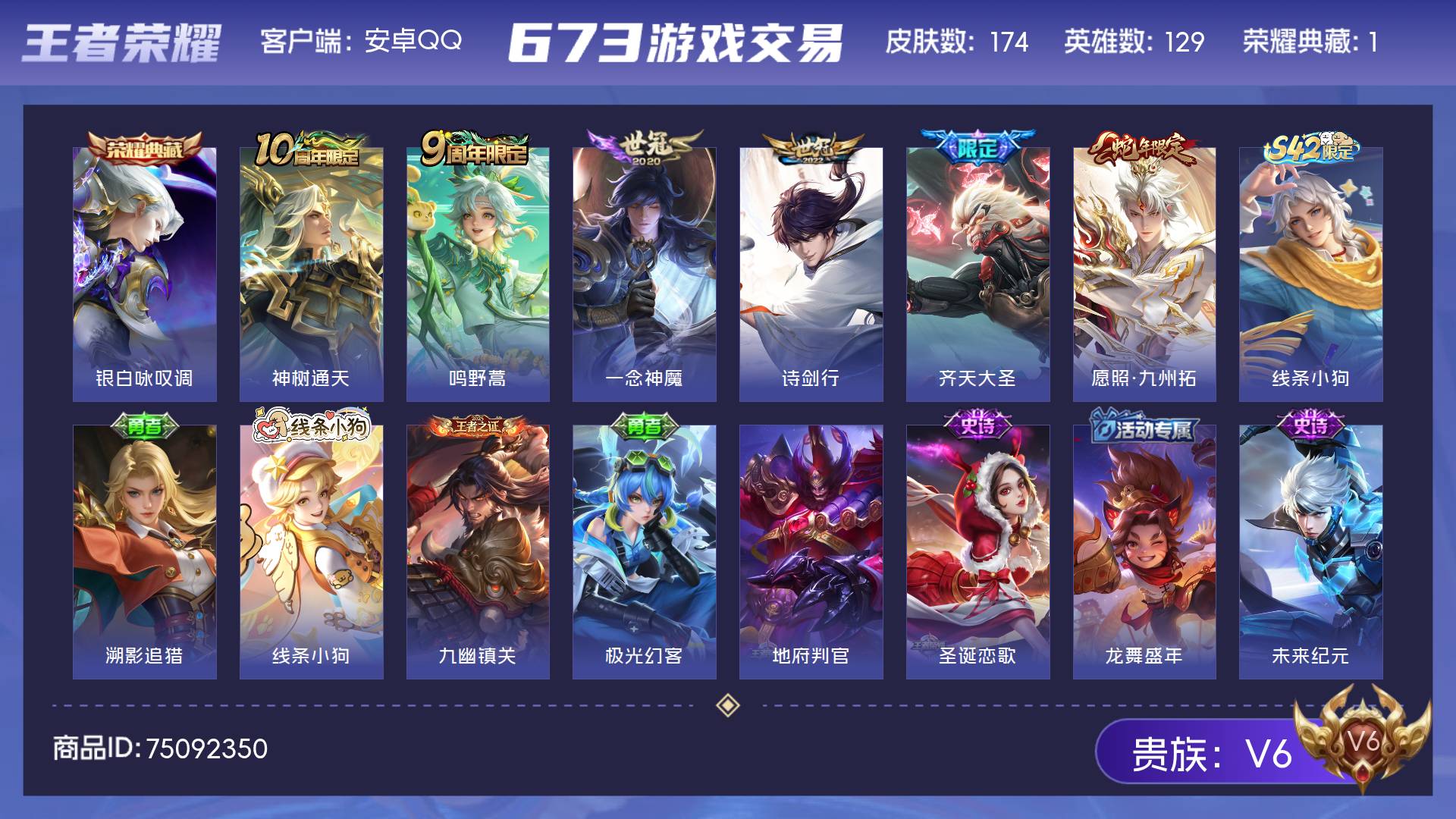V6 皮肤174 英雄129 至尊星耀 荣耀典藏1 传说6 其他皮肤174