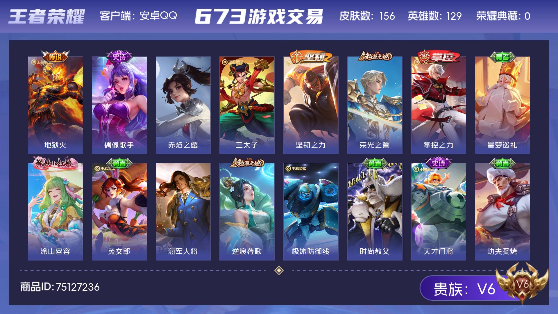 安卓QQ/无双王者/422皮肤/126英雄/3典藏/0珍品无双/5无双/2珍品传说/44传说/137