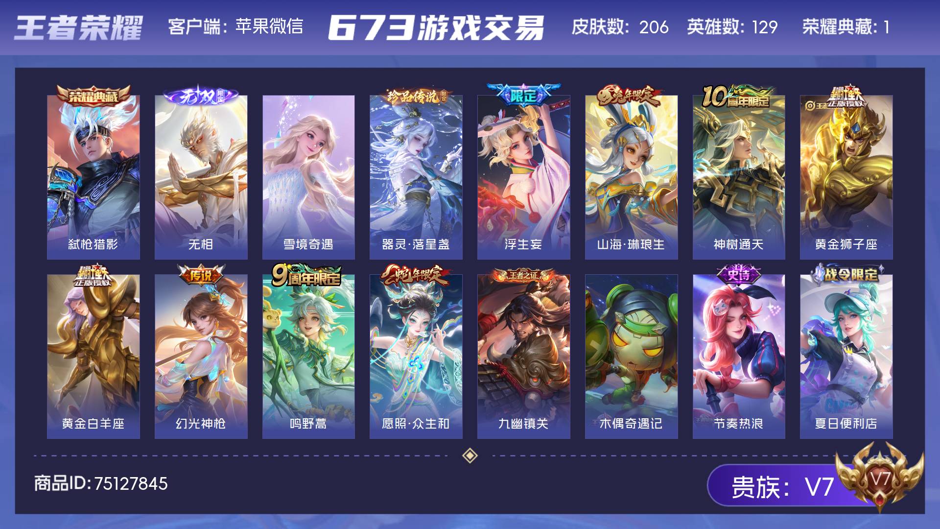 V7 皮肤206 英雄129 至尊星耀 荣耀典藏1 无双皮肤2 珍品传说1 传说8 其他皮肤199