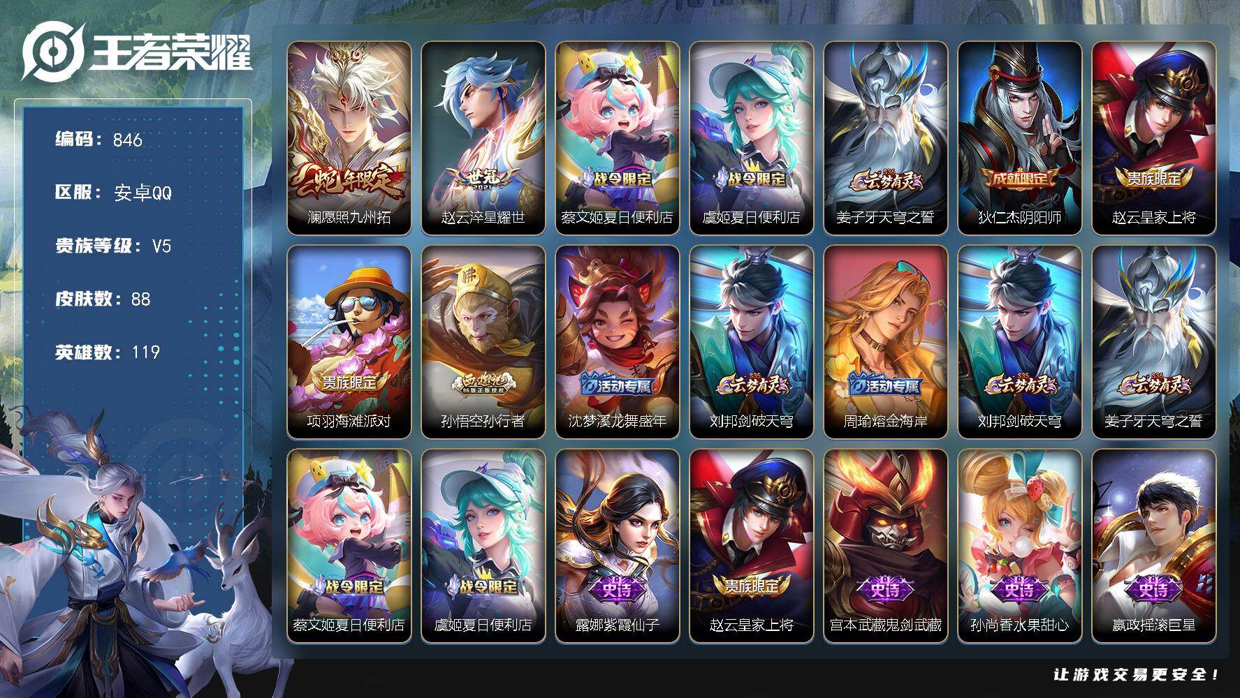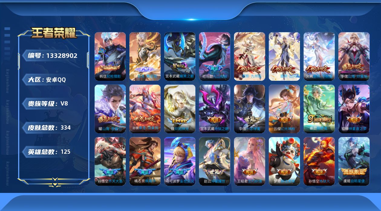 安卓QQ/荣耀王者/339皮肤/127英雄/1典藏/0珍品无双/3无双/2珍品传说/33传说/112