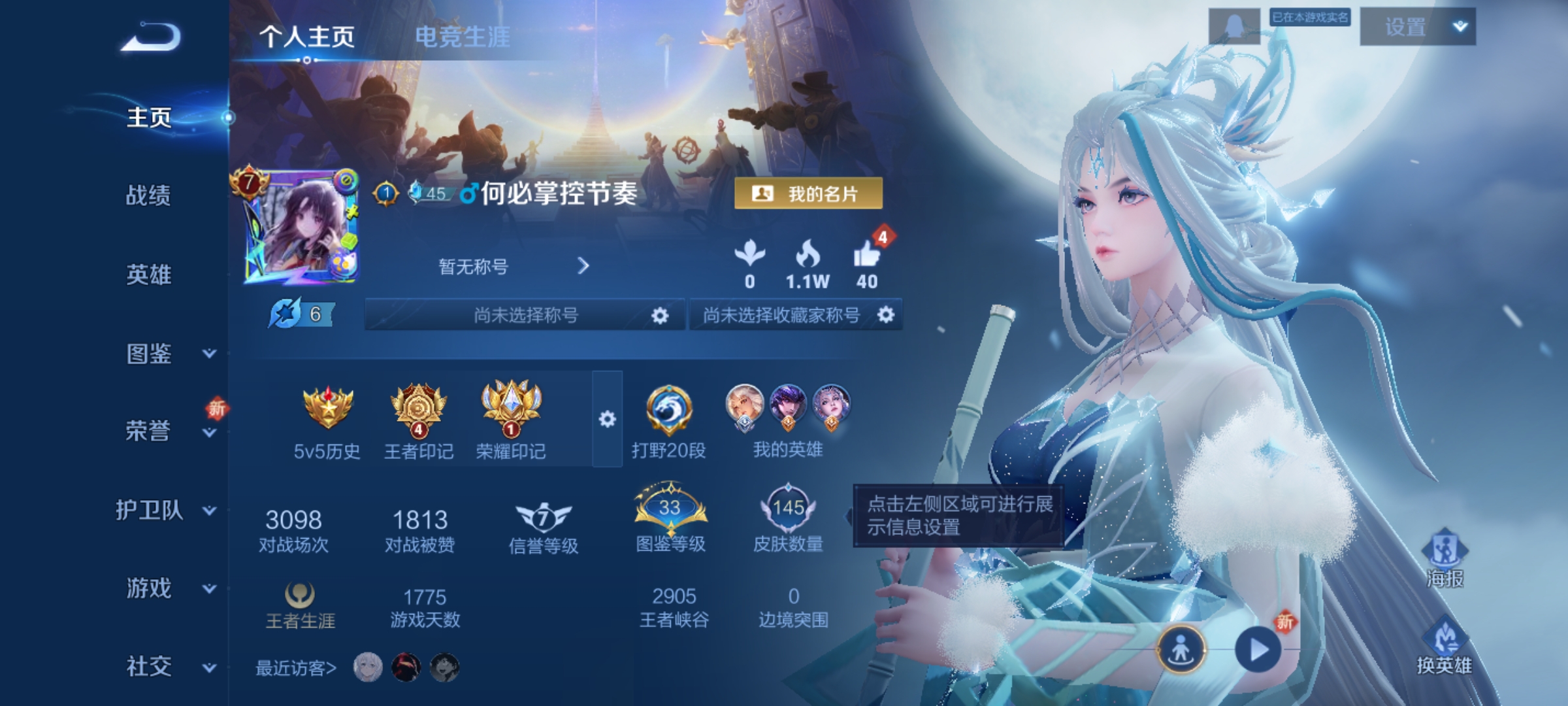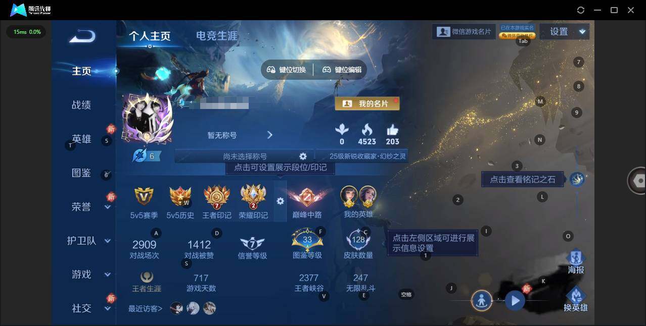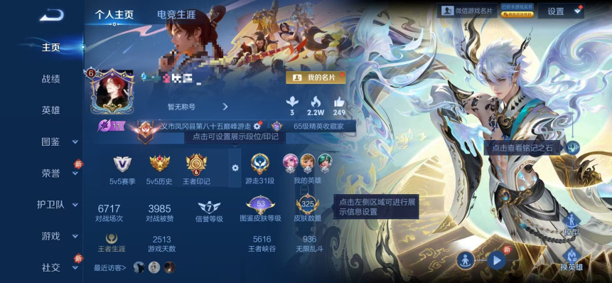 实名: 可修改 贵族等级: V7 英雄数: 127 皮肤数: 169 荣耀水晶