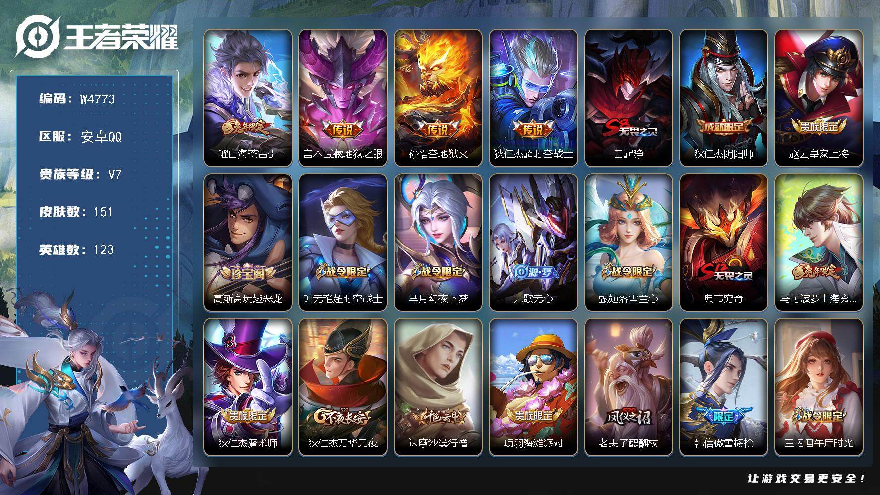 【W4773】社交限制-安卓Q-无二次-贵7-123英雄-150皮肤-4传说-