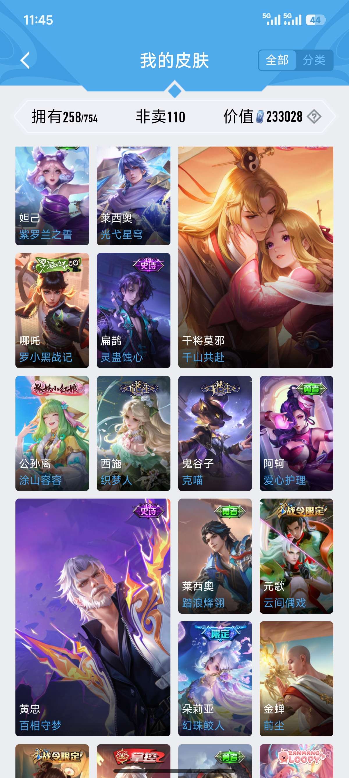 皮肤258 英雄126 至圣王者 荣耀典藏3 珍品传说1 传说12 其他皮肤82-典藏几个传说12个火影多s多金币