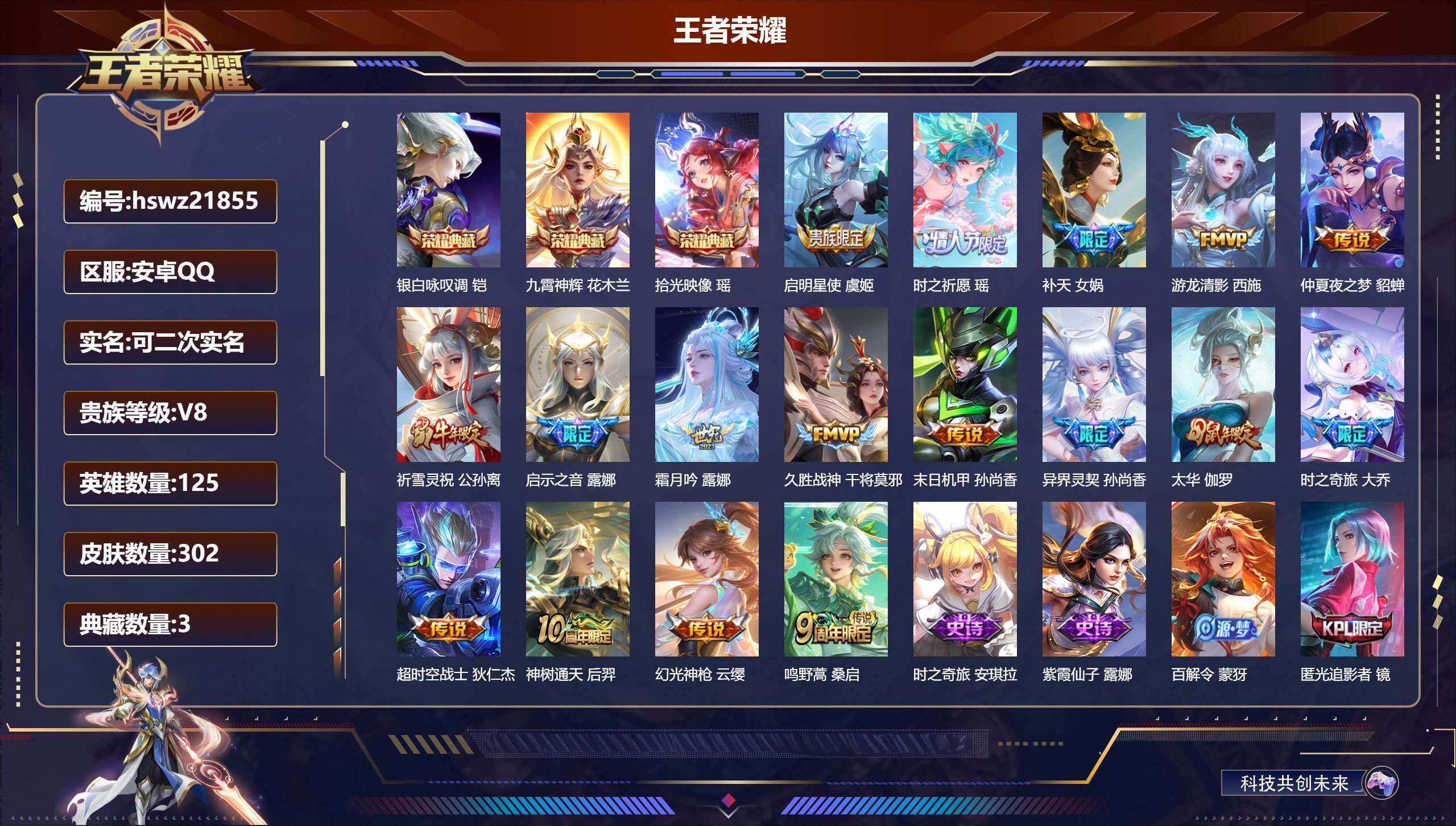 安卓QQ/荣耀黄金/302皮肤/125英雄/3典藏/0珍品无双/0无双/0珍品传说/17传说/94史
