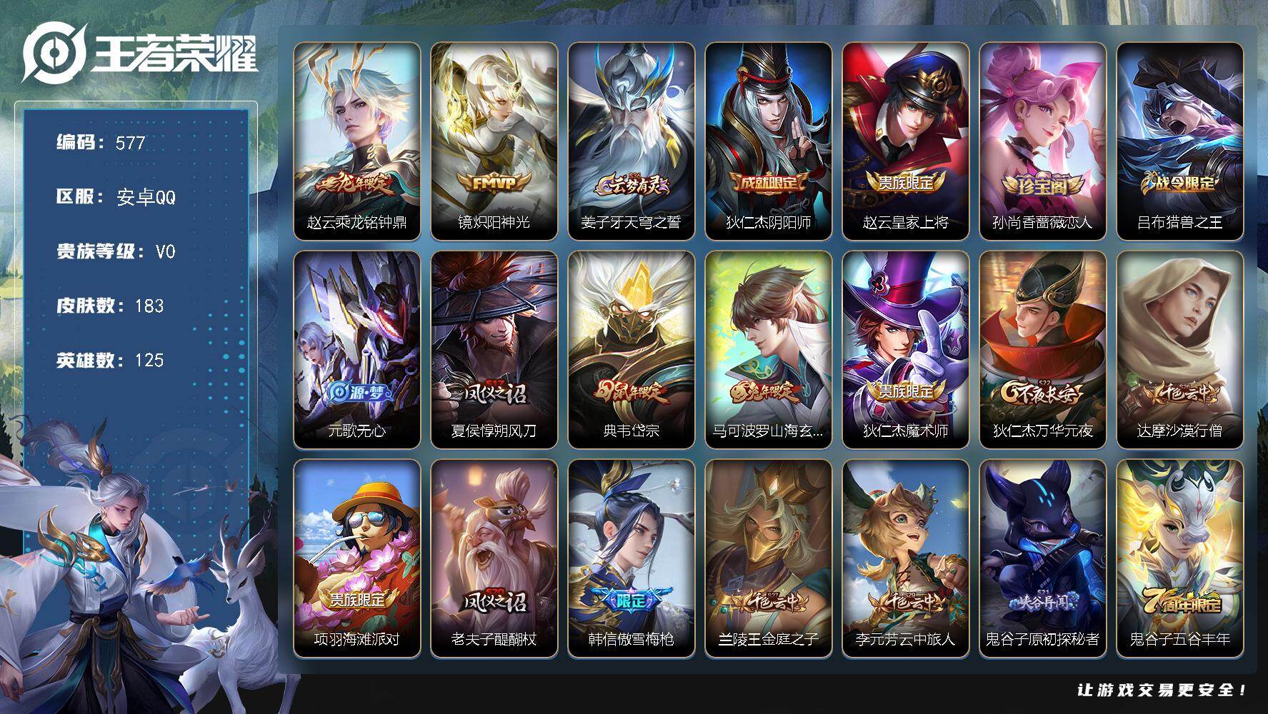 安卓Q-V0-至尊星耀V段位-125英雄-183皮肤-2传说-43史诗【传说