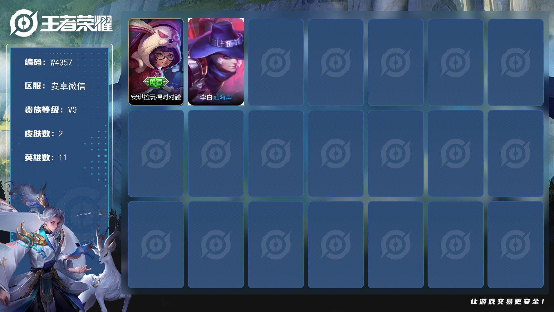 【W4357】1年多练手号-安卓微信-可二次-11英雄-2皮肤-营地ID:15