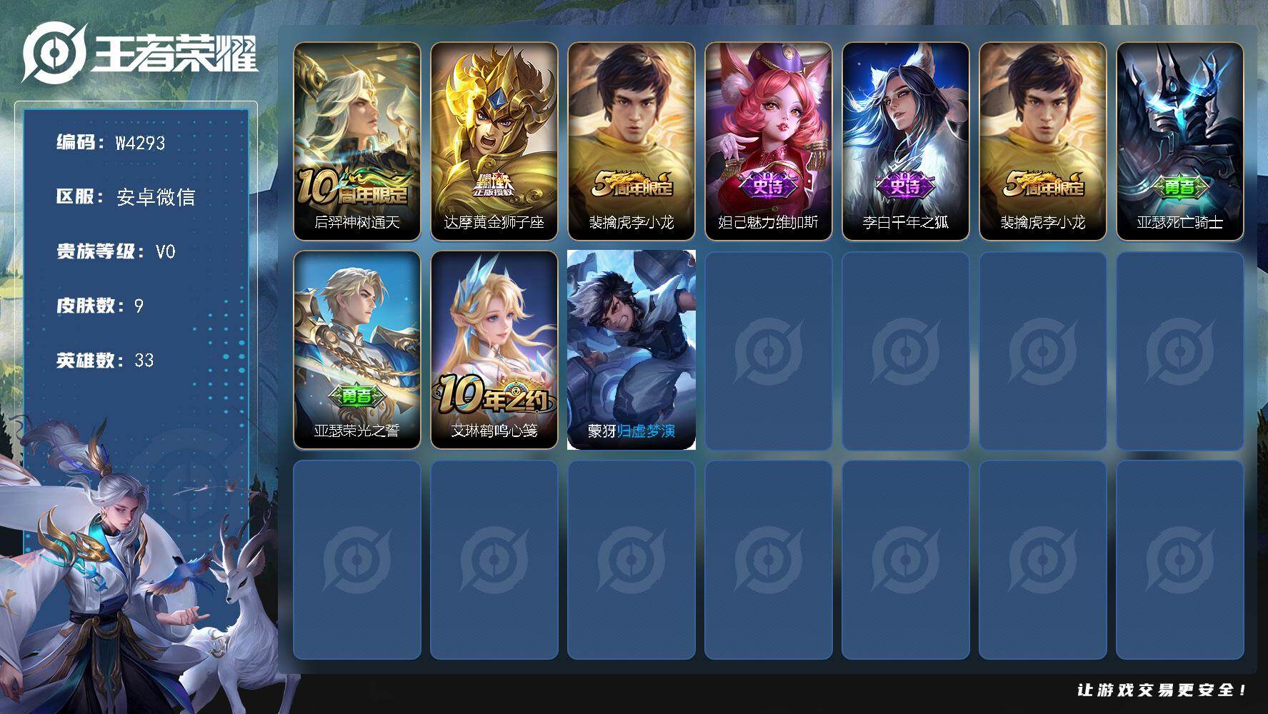 【W4293】1年多微信-安卓微信-可二次-33英雄-9皮肤-2传说-3史诗-