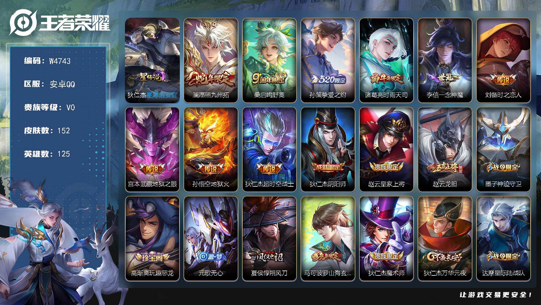 【W4743】安卓QQ-有二次-贵7-125英雄-152皮肤-9传说-1星元-