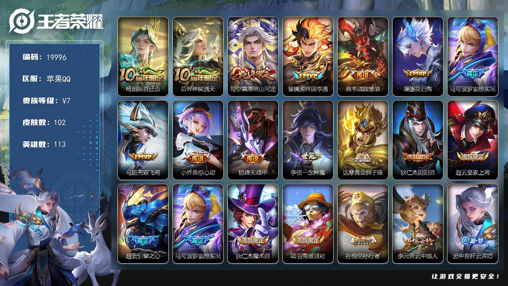 苹果QQ/至尊星耀/321皮肤/127英雄/2典藏/0珍品无双/2无双/0珍品传说/26传说/92史