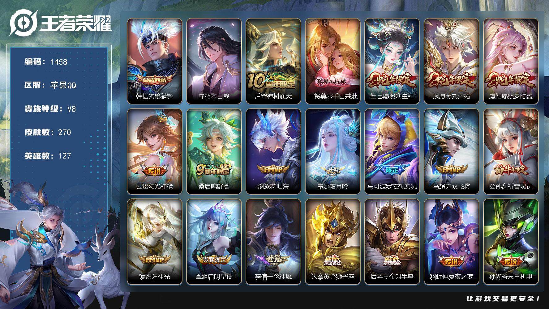 皮肤262 英雄126 尊贵铂金 荣耀典藏2 传说5 其他皮肤119-【2典藏5传说】安卓Q-V0-尊贵铂金II段位-126英雄-262皮肤-2典藏