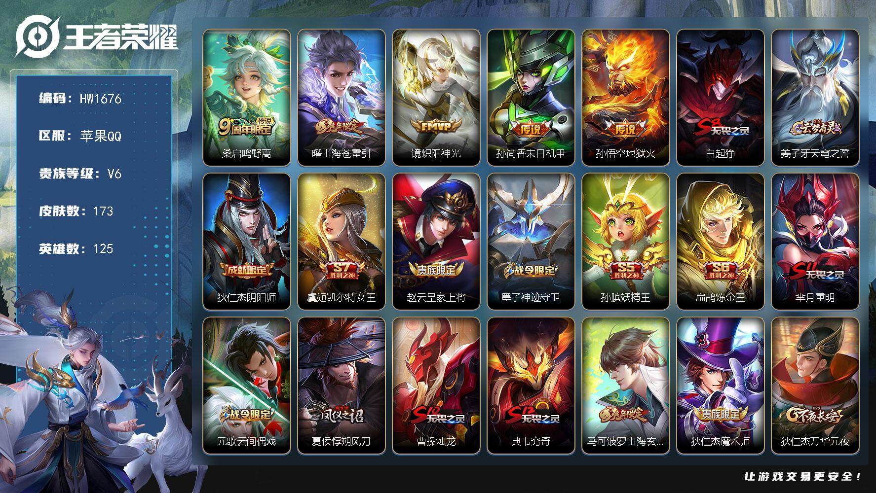皮肤173 英雄125 非凡王者 传说5 其他皮肤76-iOS【1.1w小国标守约/金标苍】173皮肤5传说 朱雀志 曜山海苍雷引 炽