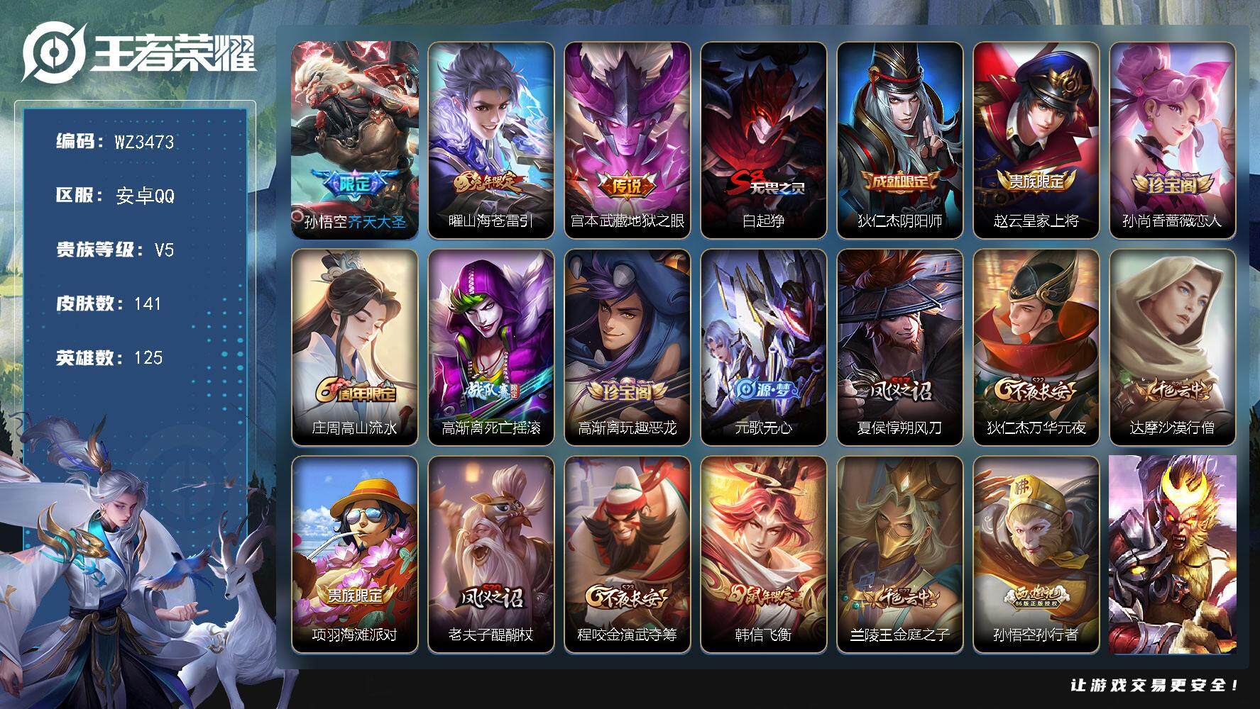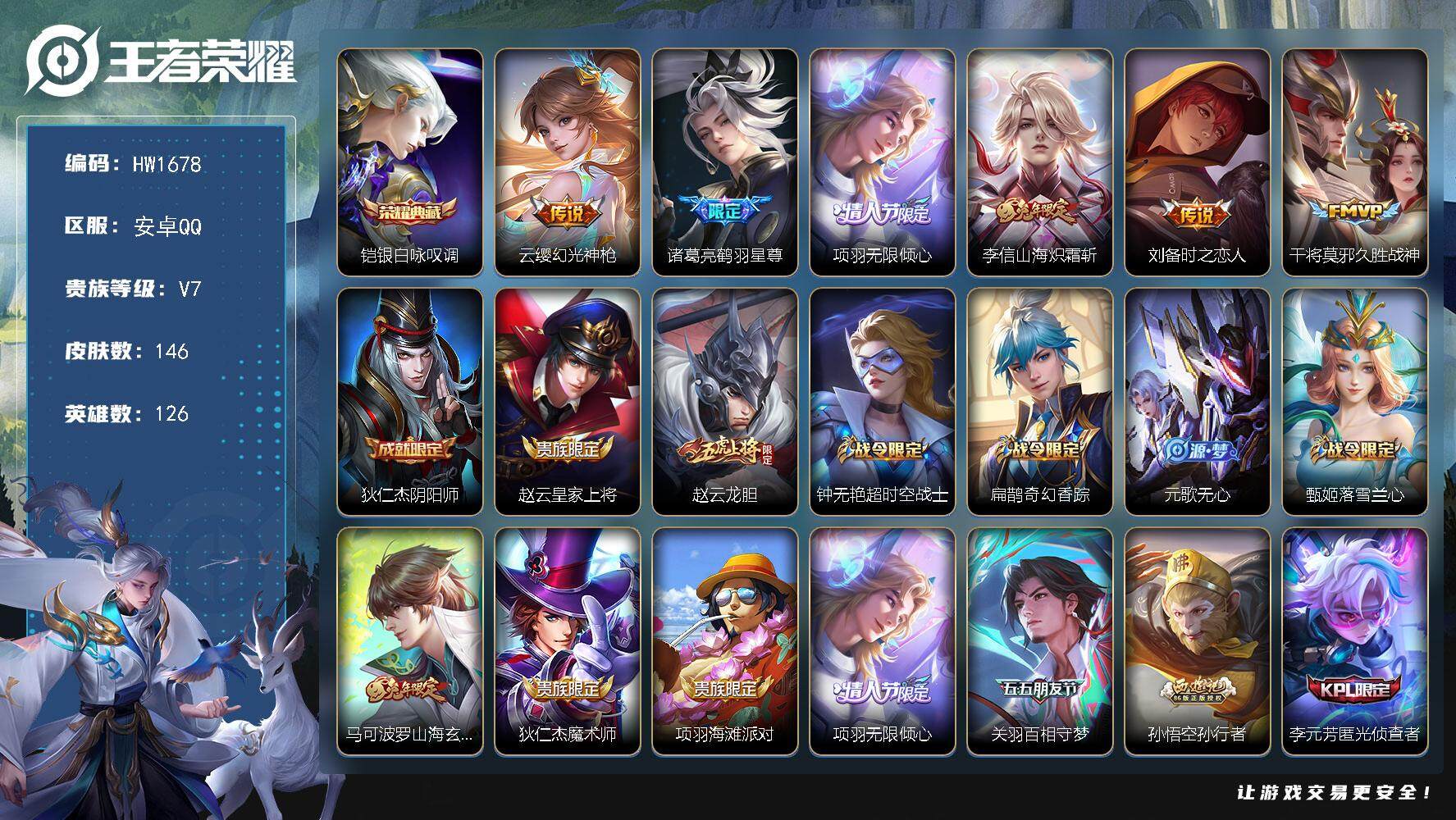 安卓QQ/绝世王者/233皮肤/126英雄/1典藏/0珍品无双/2无双/1珍品传说/20传说/66史