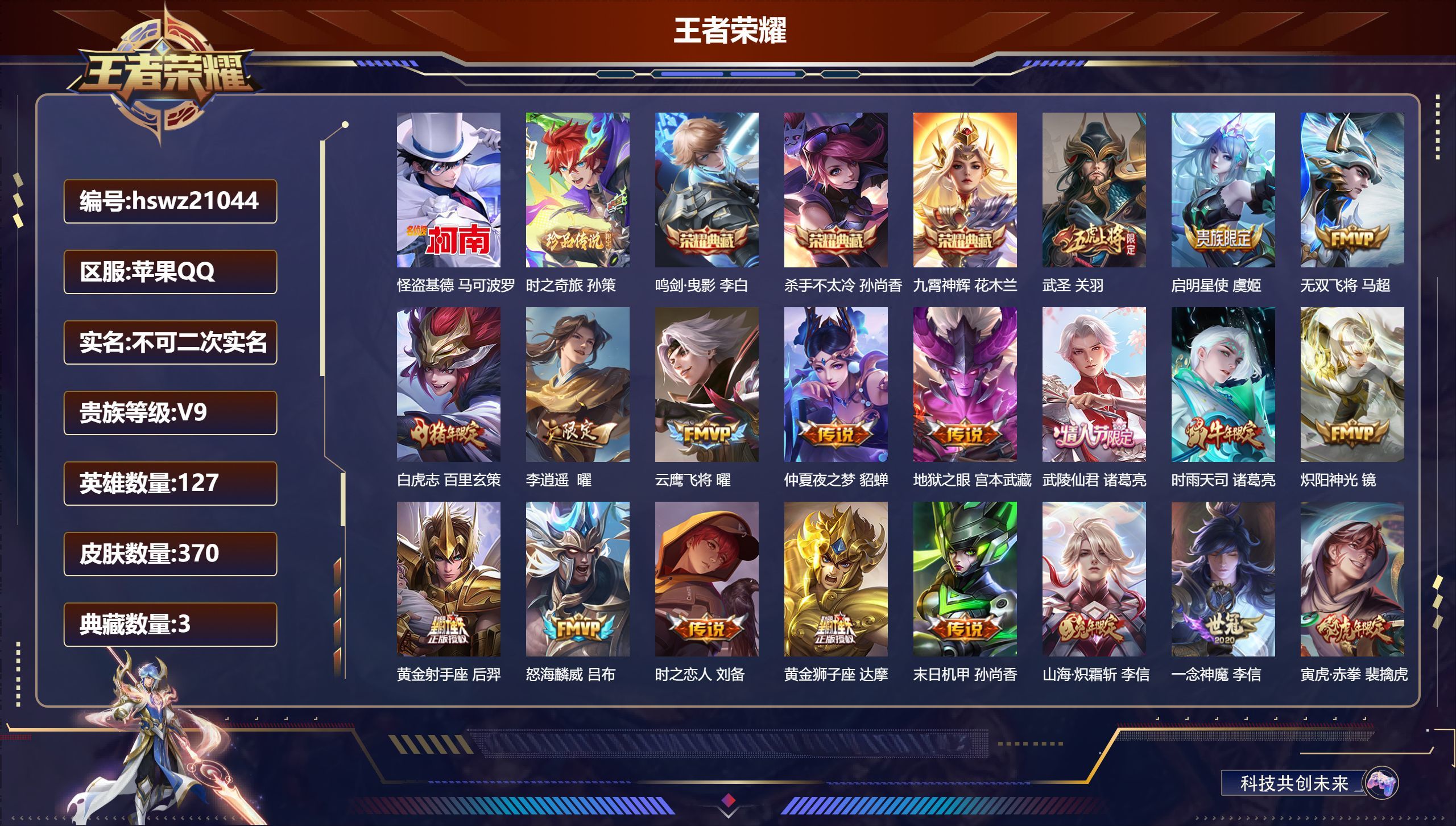 苹果QQ/荣耀王者/370皮肤/127英雄/3典藏/0珍品无双/0无双/2珍品传说/26传说/118