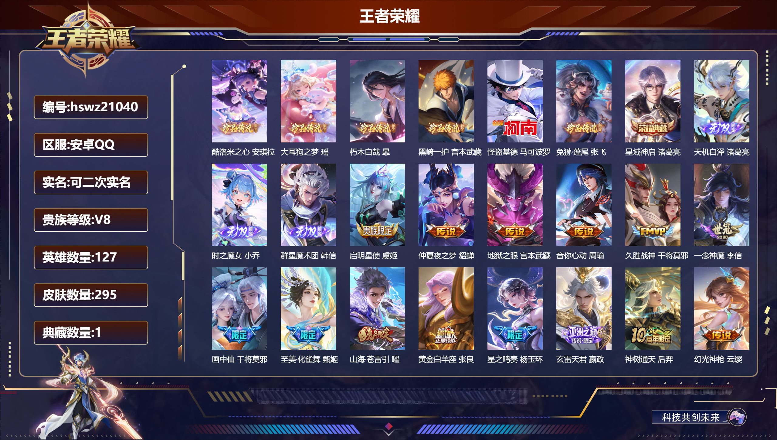 安卓QQ/荣耀王者/295皮肤/127英雄/1典藏/1珍品无双/3无双/6珍品传说/17传说/74史
