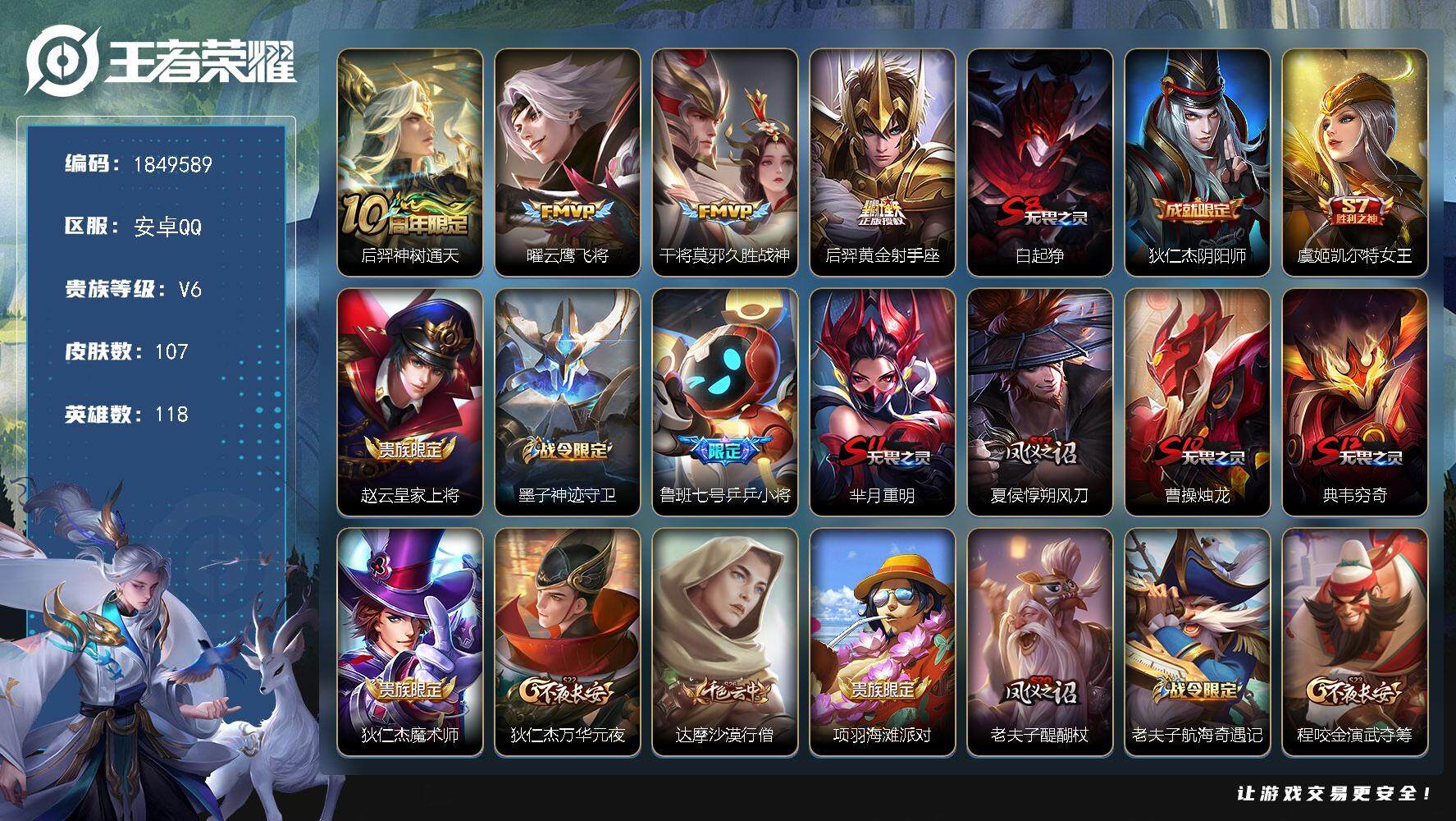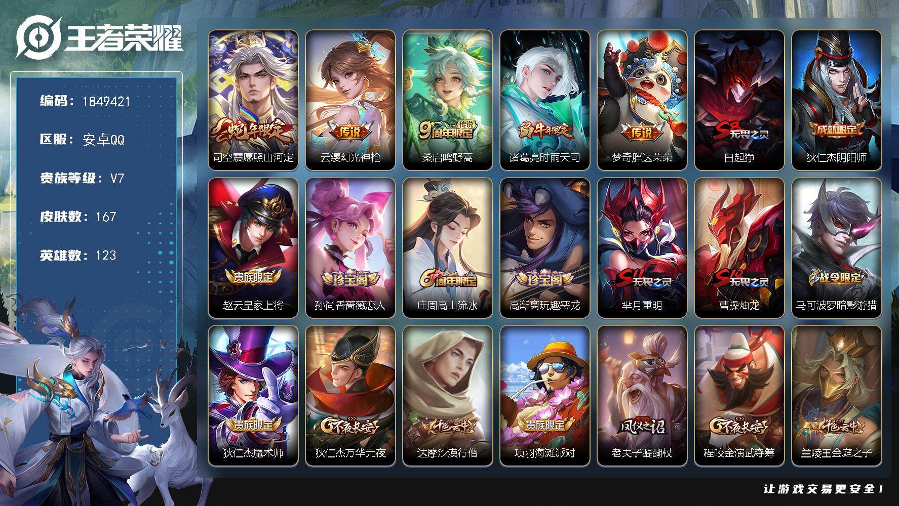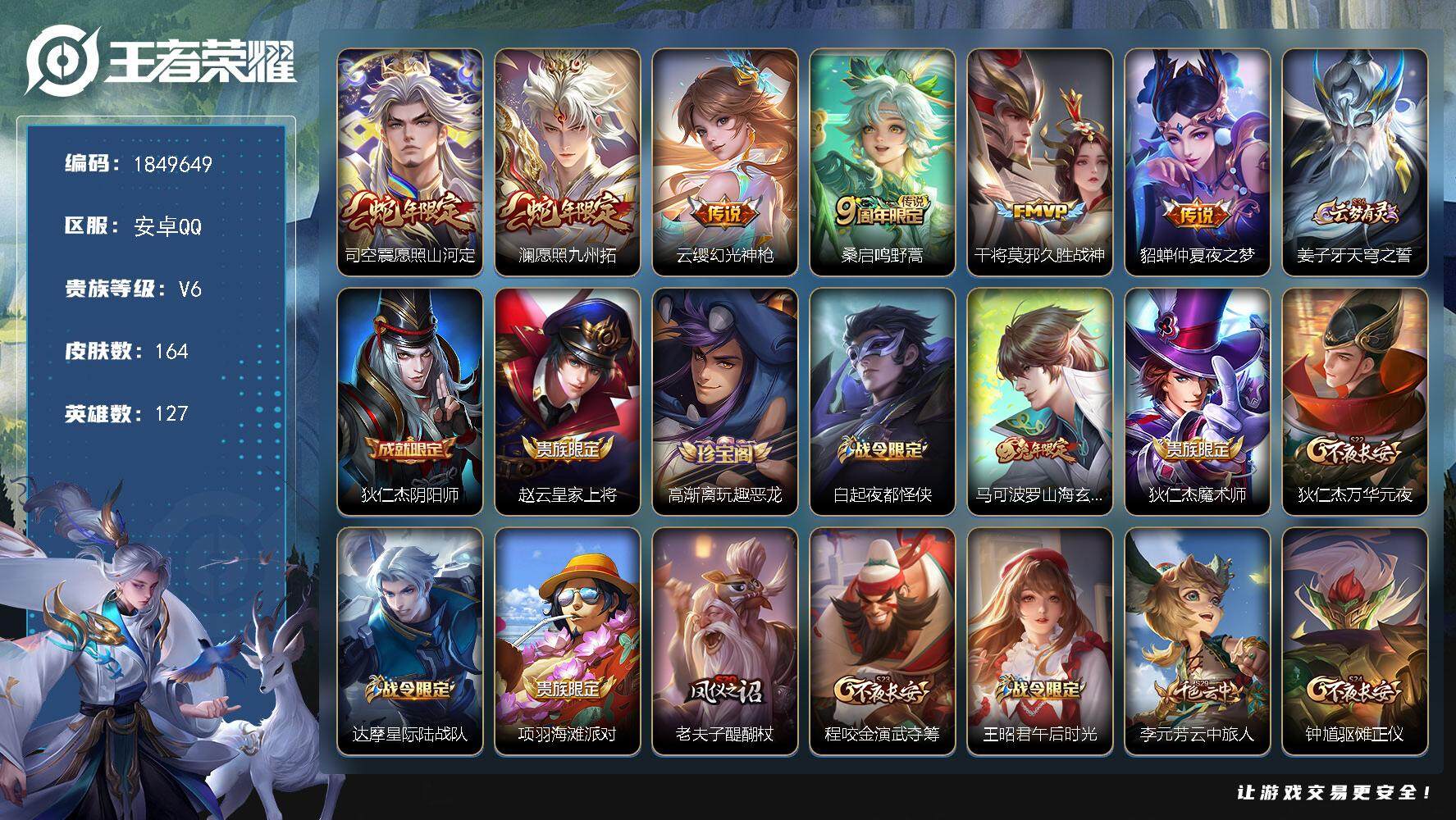 安卓QQ/荣耀王者/372皮肤/127英雄/3典藏/0珍品无双/1无双/9珍品传说/38传说/107