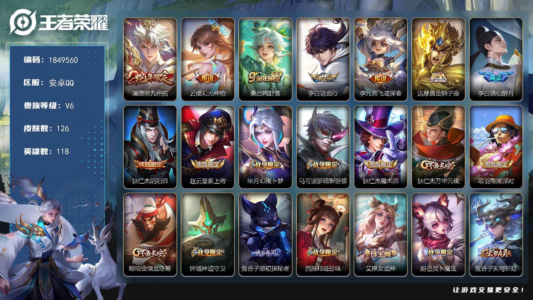 安卓QQ/荣耀王者/335皮肤/126英雄/1典藏/0珍品无双/1无双/1珍品传说/42传说/105