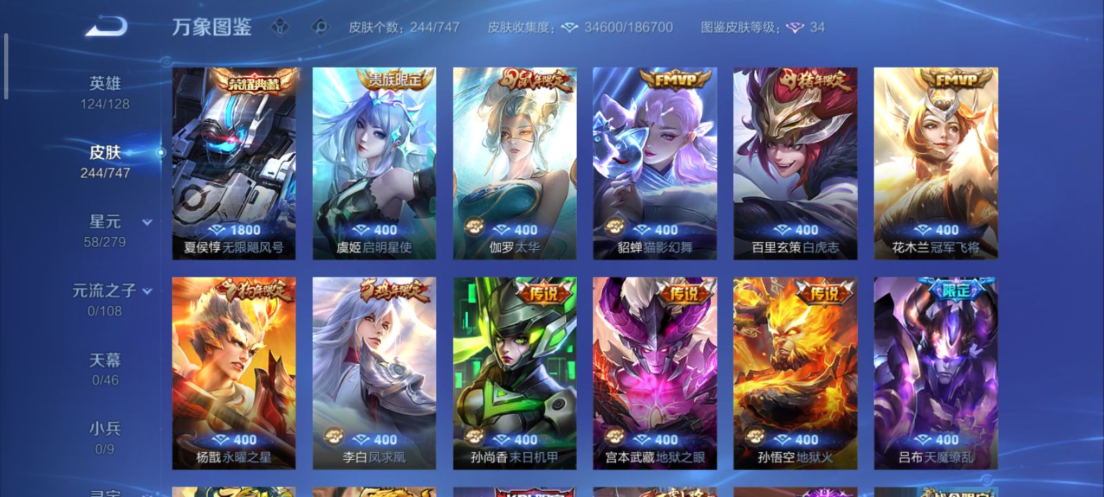 安卓QQ/荣耀王者/182皮肤/117英雄/1典藏/1珍品无双/1无双/5珍品传说/16传说/59史