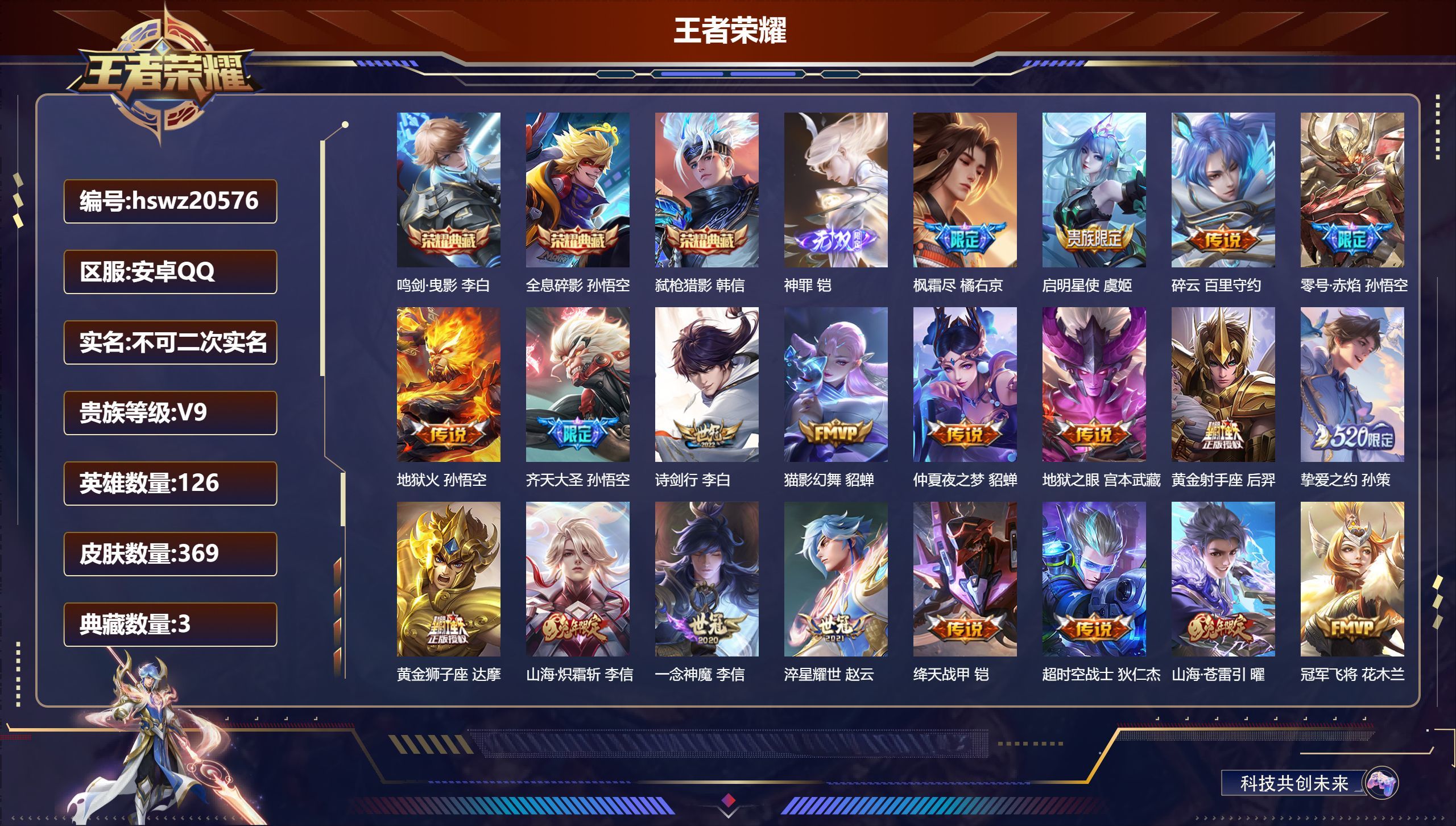 安卓QQ/无双王者/369皮肤/126英雄/3典藏/0珍品无双/1无双/0珍品传说/22传说/114