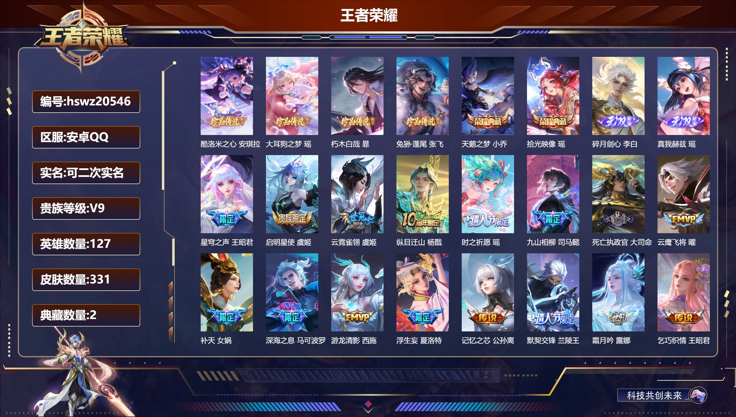 安卓QQ/荣耀王者/331皮肤/127英雄/2典藏/1珍品无双/2无双/4珍品传说/31传说/102