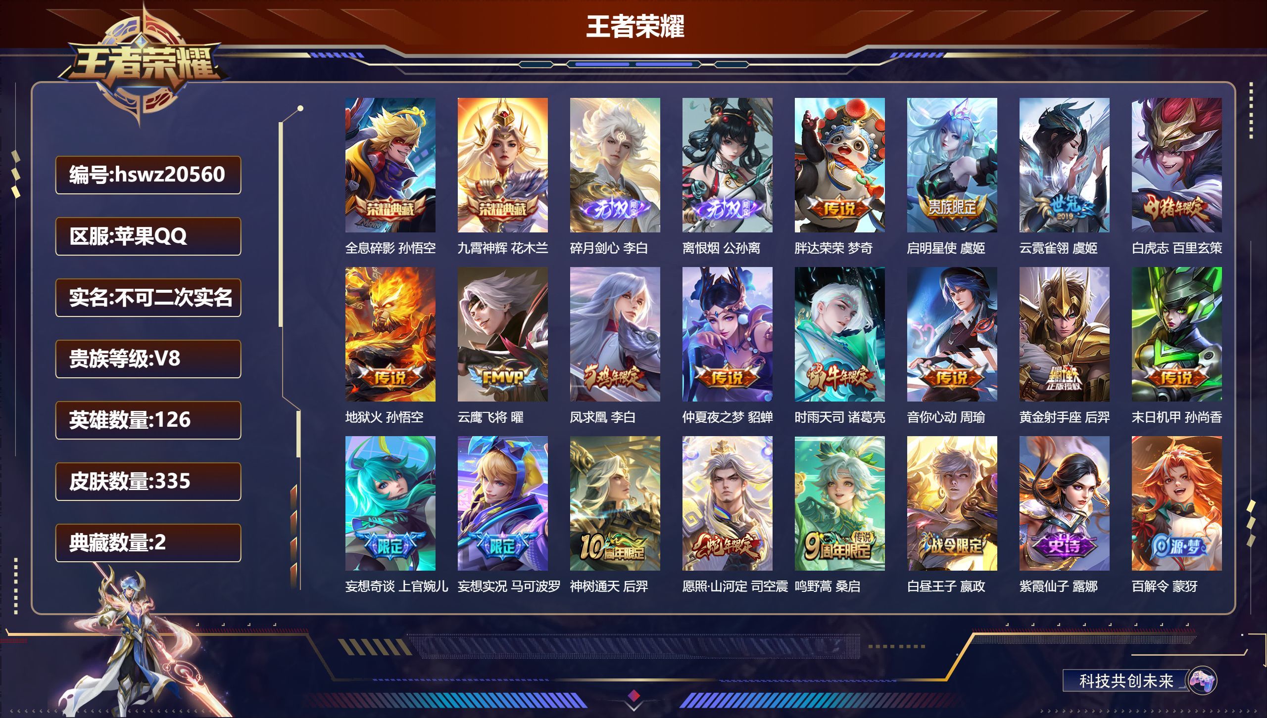 苹果QQ/至尊星耀/335皮肤/126英雄/2典藏/0珍品无双/2无双/0珍品传说/17传说/88史
