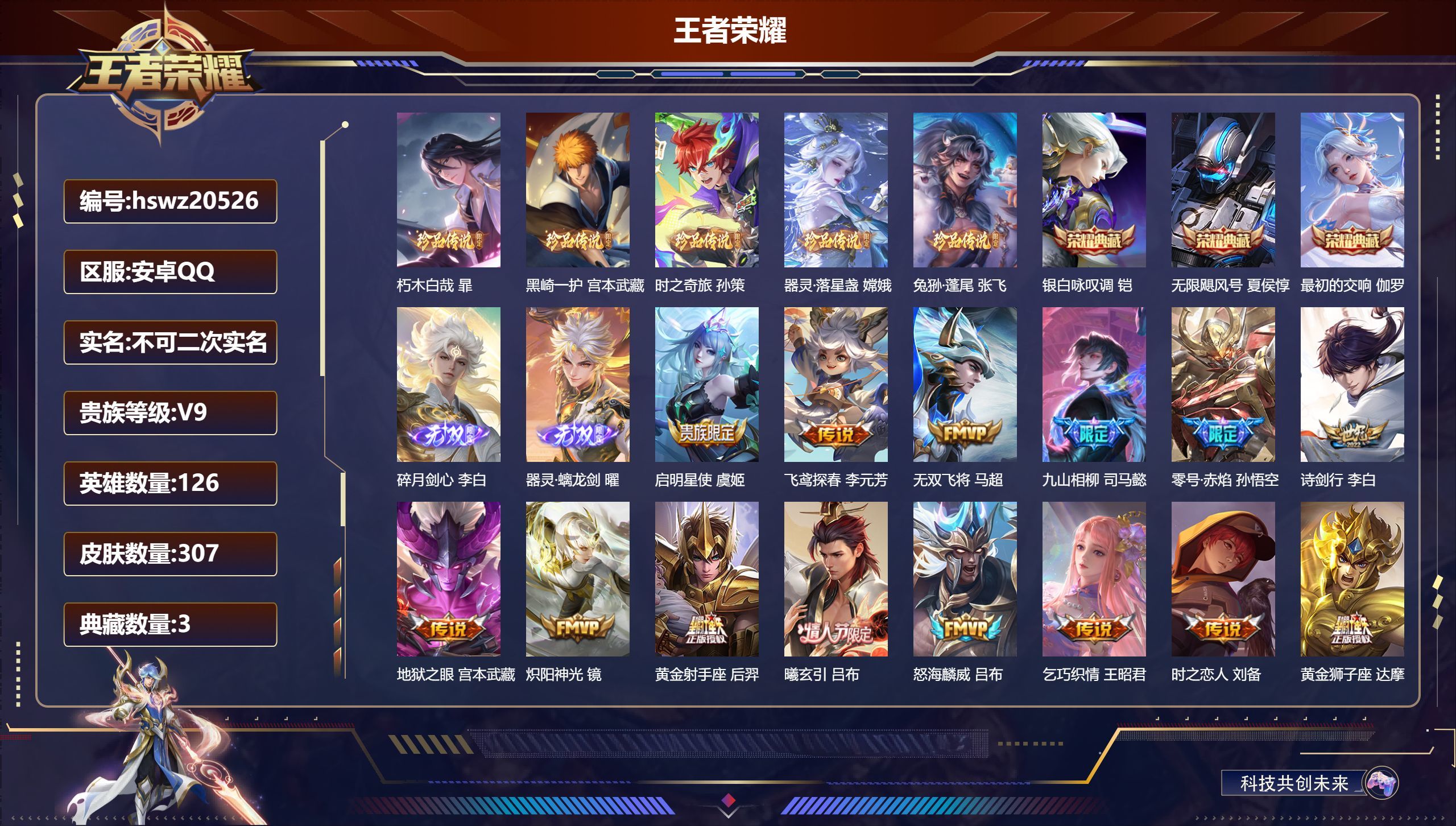安卓QQ/无双王者/171皮肤/127英雄/0典藏/0珍品无双/0无双/4珍品传说/8传说/52史诗