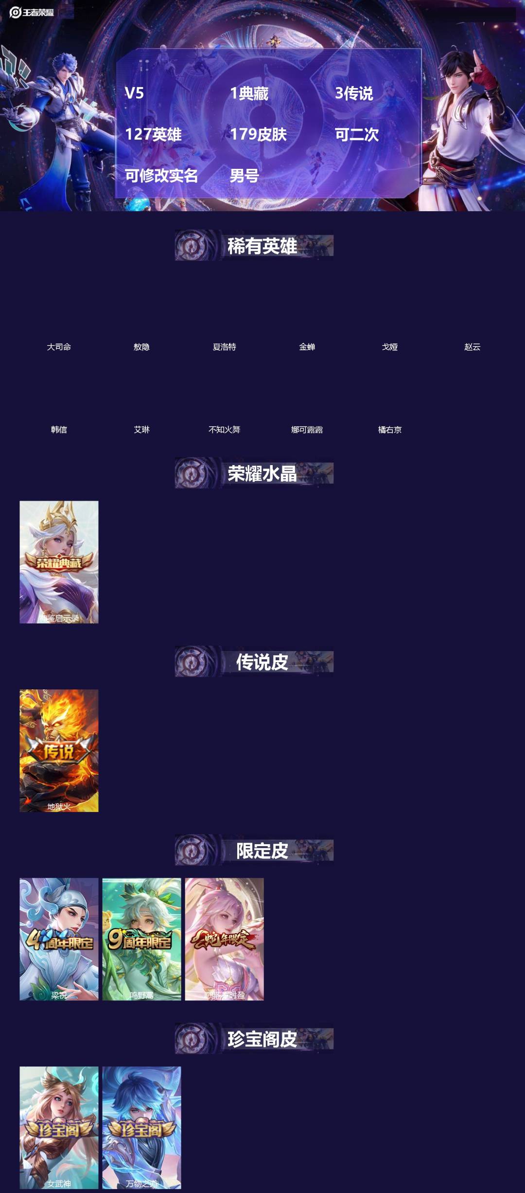 []V7 1典藏 9传说 127英雄 176皮肤 可修改实名 女号 【英雄全皮