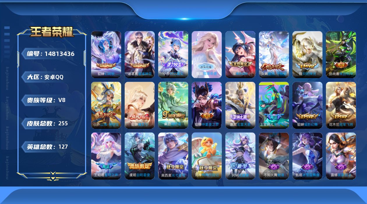 安卓QQ 皮肤255 英雄127 典藏2 无双3 传说13 其他皮肤67 至尊星耀-