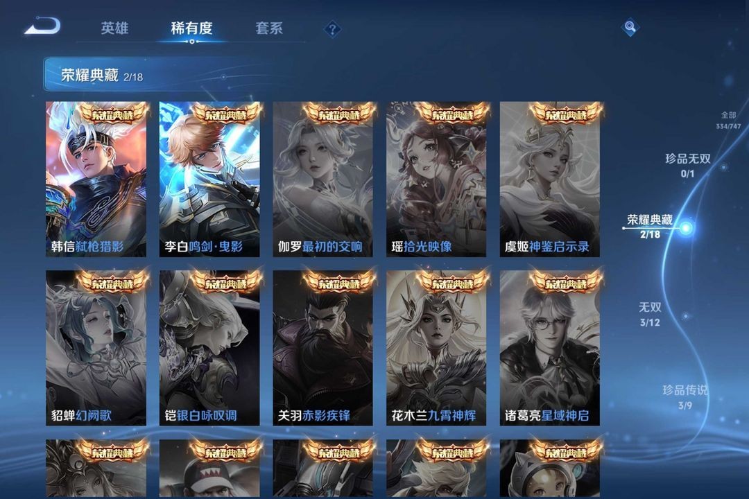 韩信典藏/金乌海月/至尊宝+娶亲皮肤数量285印记总数5V7