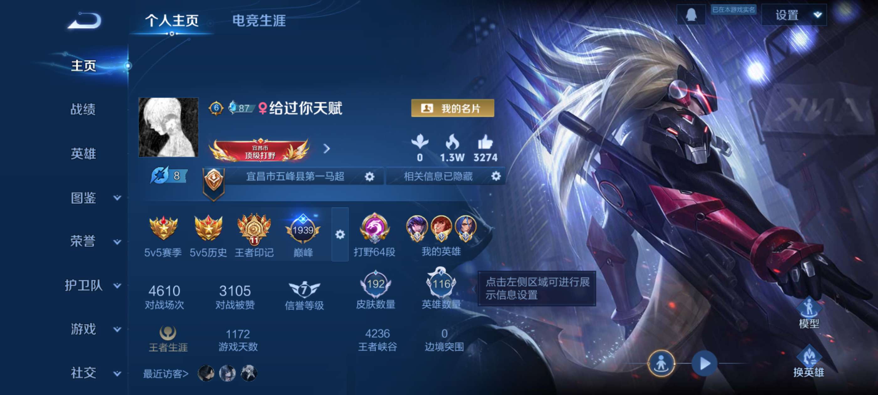 李白典藏/武圣/云鹰皮肤数量232印记总数6V7荣耀黄金可修