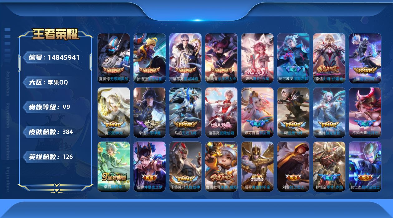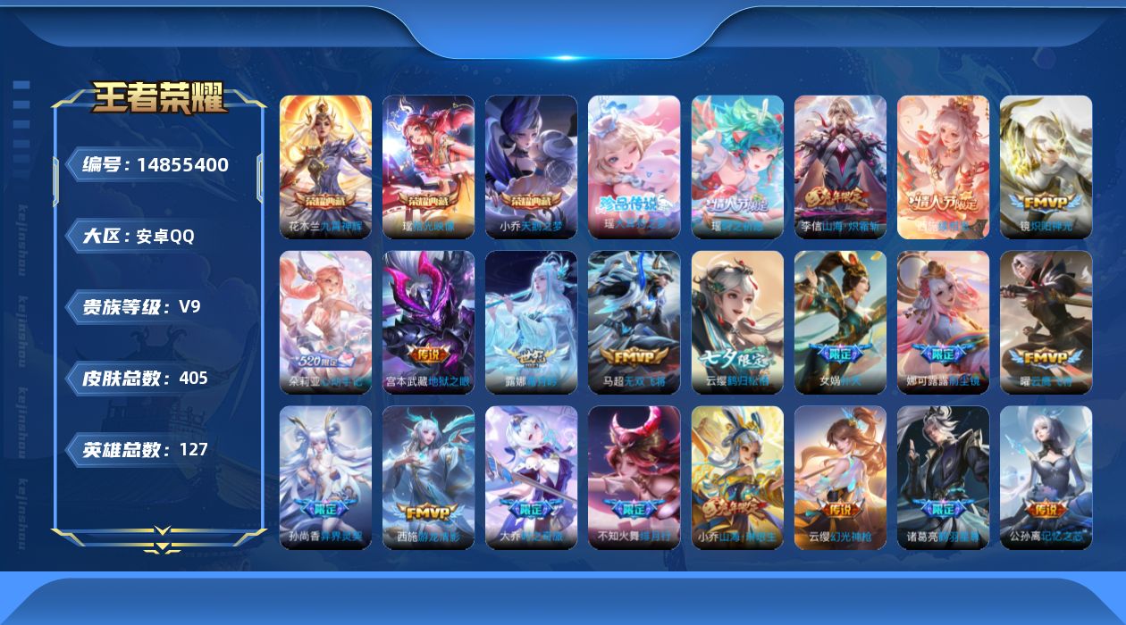 安卓QQ-可二次-金标猴子155皮肤4传说1星元九州拓地狱火、秒换绑不用等