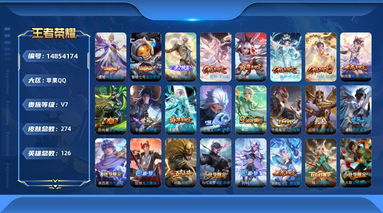 ky v10贵族 金标百里守约 金标韩信 可认证 苹果(q)区 536皮 11典藏 2无双 73