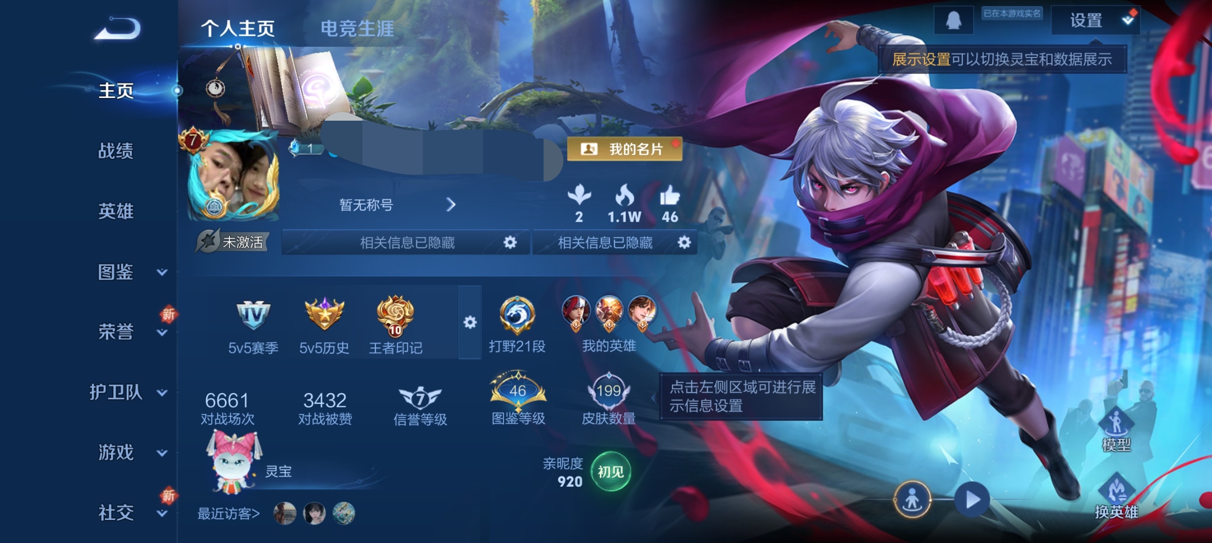 实名: 可修改 贵族等级: V7 英雄数: 128 皮肤数: 267 荣耀水晶